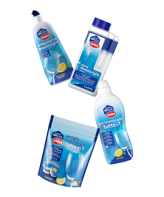 Grazie ai prodotti Casa Bella Selex, la tua lavastoviglie di casa funzionerà sempre al meglio, eliminando il grasso e regalandoti un fresco profumo di limone a ogni lavaggio. Non dovrai fare la fatica di sfregare o di tenere a lungo pentole e piatti immersi in acqua e sapone, ti basterà caricare il tuo elettrodomestico con cura, scegliere il tipo di lavaggio e inserire nello sportello una delle diverse opzioni di detergenti Casa Bella, disponibili in differenti formati per soddisfare ogni esigenza. Dalle pastiglie al gel tutto in 1. E per la cura periodica del tuo apparecchio che ti garantirà la sua lunga durata e il funzionamento ottimale, non dimenticare di tenere in casa anche brillantante e cura lavastoviglie.