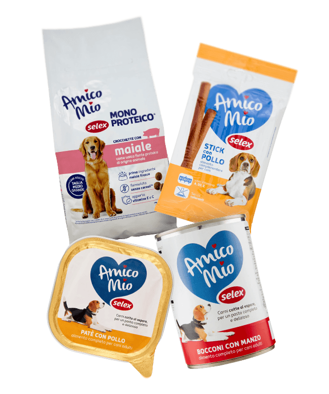 Stick con pollo, crocchette con maiale, patè con pollo, bocconcini con manzo, carni cotte al vapore per un pasto completo e delizioso… la linea di alimenti per cane Amico Mio Selex sembra il menu di un ristorante.