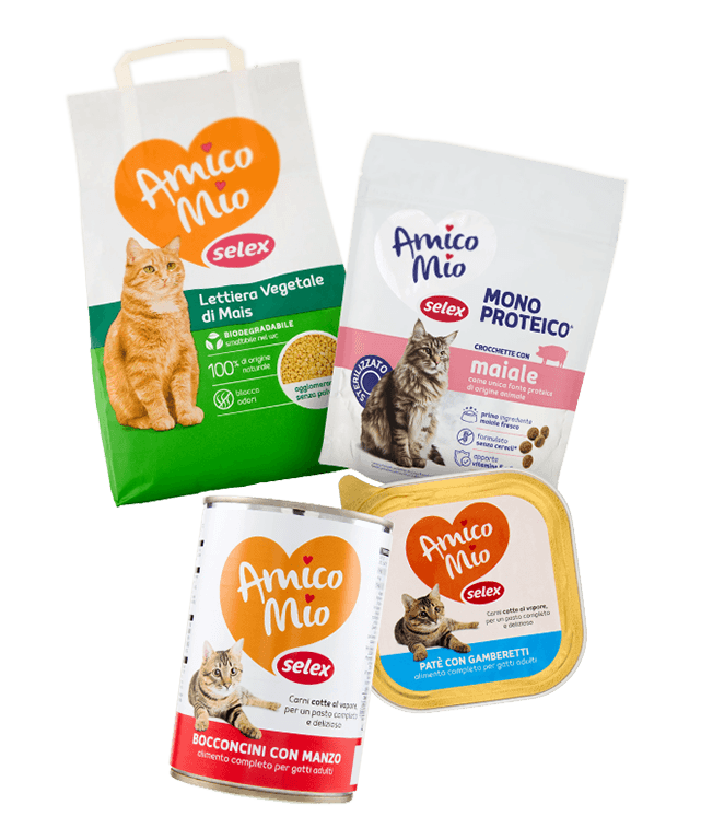Una vasta gamma di referenze diverse perché, si sa, i gatti hanno i loro gusti, ma tutte preparate anche con carni fresche, senza coloranti e no cruelty tested. E per chi ha esigenze specifiche nella linea Amico Mio Selex trovi anche i prodotti monoproteici e senza cereali, come le crocchette con maiale, che garantiscono entrambe queste specifiche caratteristiche. A completamento della linea: una selezione di prodotti per l’igiene, tra cui spiccano lettiere di diverse tipologie, come quella plus al profumo di lavanda, ma anche l’opzione vegetale a base mais, per te che ami gli animali e desideri rispettare la natura in ogni gesto.