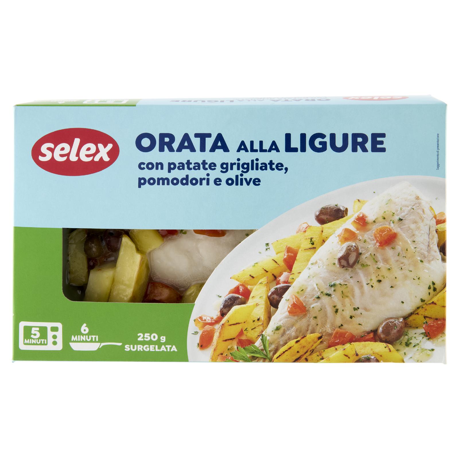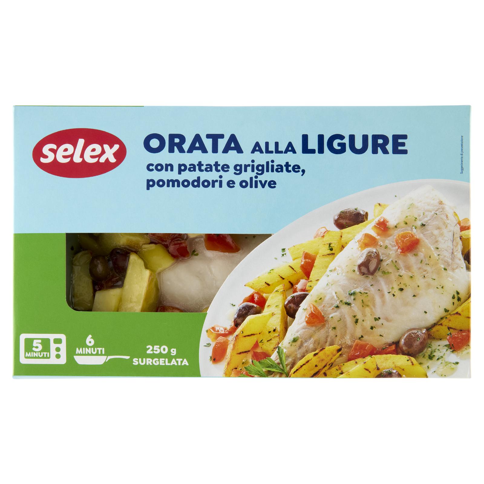 - Filetto di orata 36% Patate grigliate 24% Pomodoro 24% Condimento 11% (olio extravergine d'oliva, olio di semi di girasole, acqua, amido di patate, sale, prezzemolo, aglio, pepe nero, timo, salvia, basilico) Olive denocciolate 3% Prezzemolo 0,2% Senza glutine Può contenere crostacei, molluschi, sedano, semi di sesamo e senape