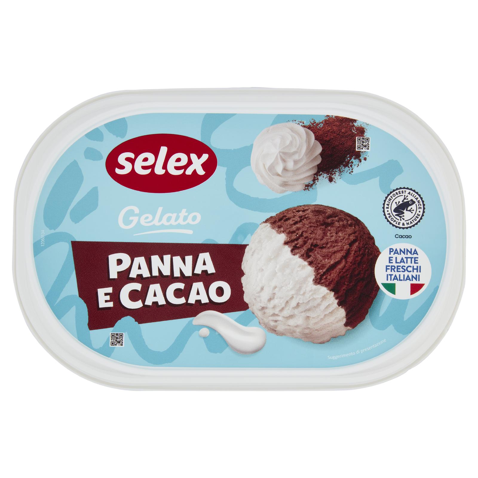 - Gelato alla panna 50% (latte scremato fresco pastorizzato italiano 50% di cui 25% sul prodotto finito, panna fresca italiana 17% di cui 8,5% sul prodotto finito, zucchero, sciroppo di glucosio, latte scremato in polvere, siero di latte in polvere, burro anidro, emulsionanti: mono- e digliceridi degli acidi grassi; addensanti: alginato di sodio, farina di semi di carrube; aromi) Gelato al cacao 50% (latte scremato fresco pastorizzato italiano 30% di cui 15% nel prodotto finito, acqua, zucchero, destrosio, sciroppo di glucosio, cacao magro in polvere* 5% di cui 2,5% sul prodotto finito, olio di cocco, pasta di cacao* 2,5% di cui 1,3% nel prodotto finito, latte scremato in polvere, siero di latte in polvere, emulsionanti: mono- e digliceridi degli acidi grassi; addensanti: alginato di sodio, farina di semi di carrube) Può contenere uova, frutta a guscio e soia Senza glutine *Certificato Rainforest Alliance.ra.org.