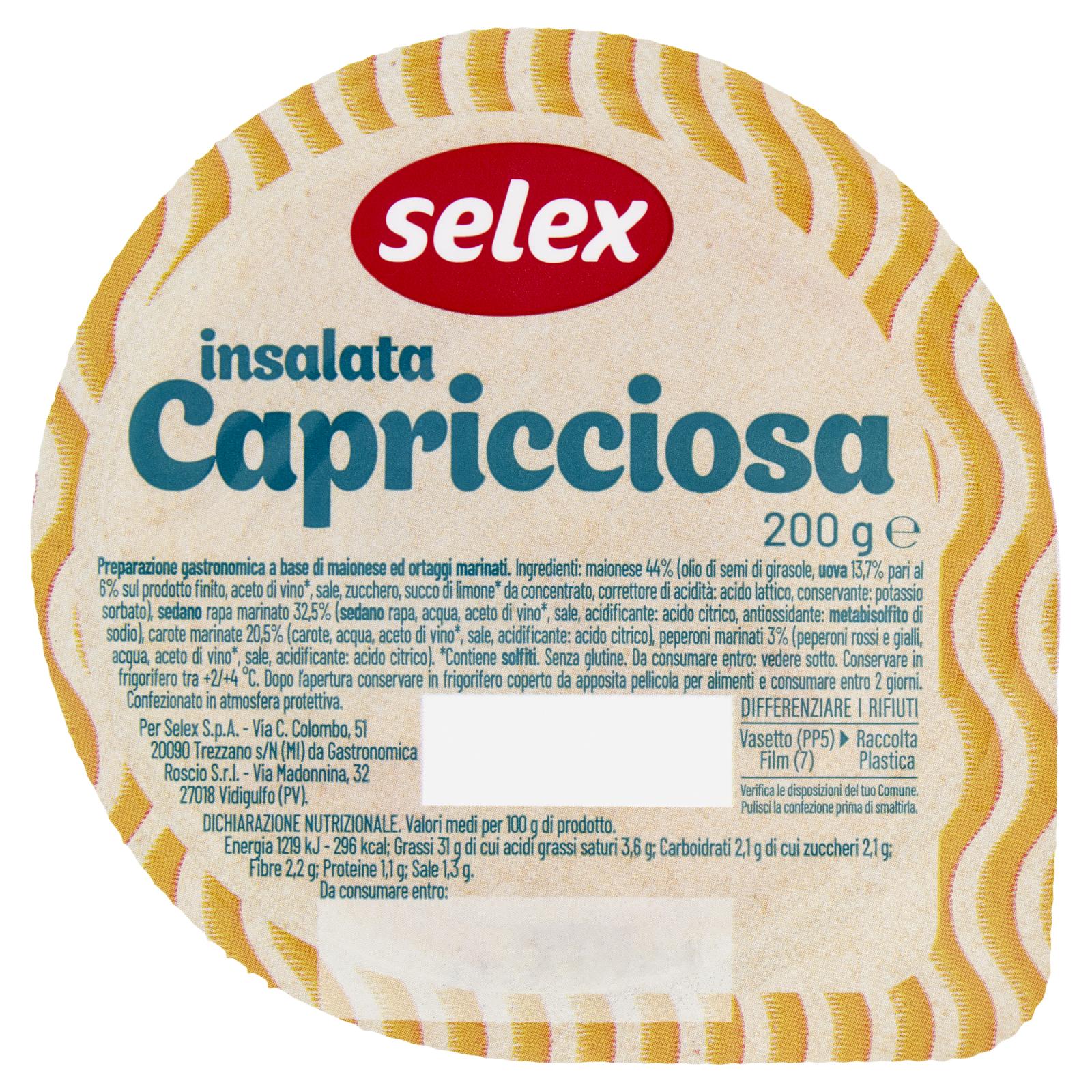 - Maionese 44% (olio di semi di girasole, uova 13,7% pari al 6% sul prodotto finito, aceto di vino*, sale, zucchero, succo di limone* da concentrato, correttore di acidità: acido lattico, conservante: potassio sorbato) Sedano rapa marinato 32,5% (sedano rapa, acqua, aceto di vino*, sale, acidificante: acido citrico, antiossidante: metabisolfito di sodio) Carote marinate 20,5% (carote, acqua, aceto di vino*, sale, acidificante: acido citrico) Peperoni marinati 3% (peperoni rossi e gialli, acqua, aceto di vino*, sale, acidificante: acido citrico) *Contiene solfiti Senza glutine