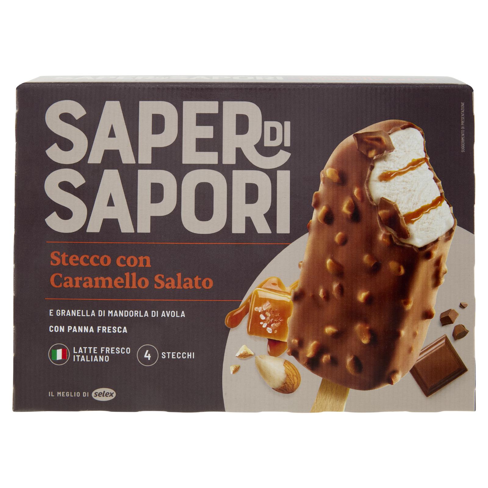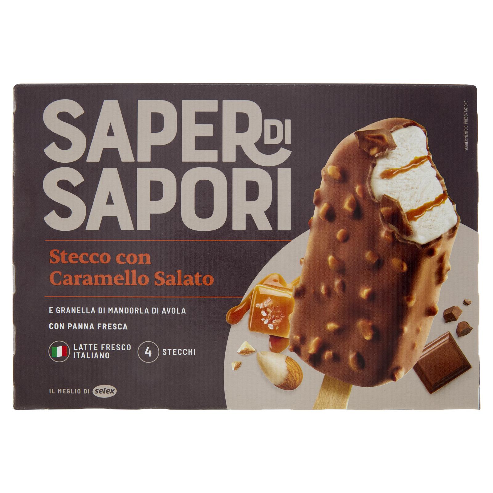 - Gelato con panna e salsa al caramello salato e burro salato, ricoperto di cioccolato al latte e granella di mandorle di avola