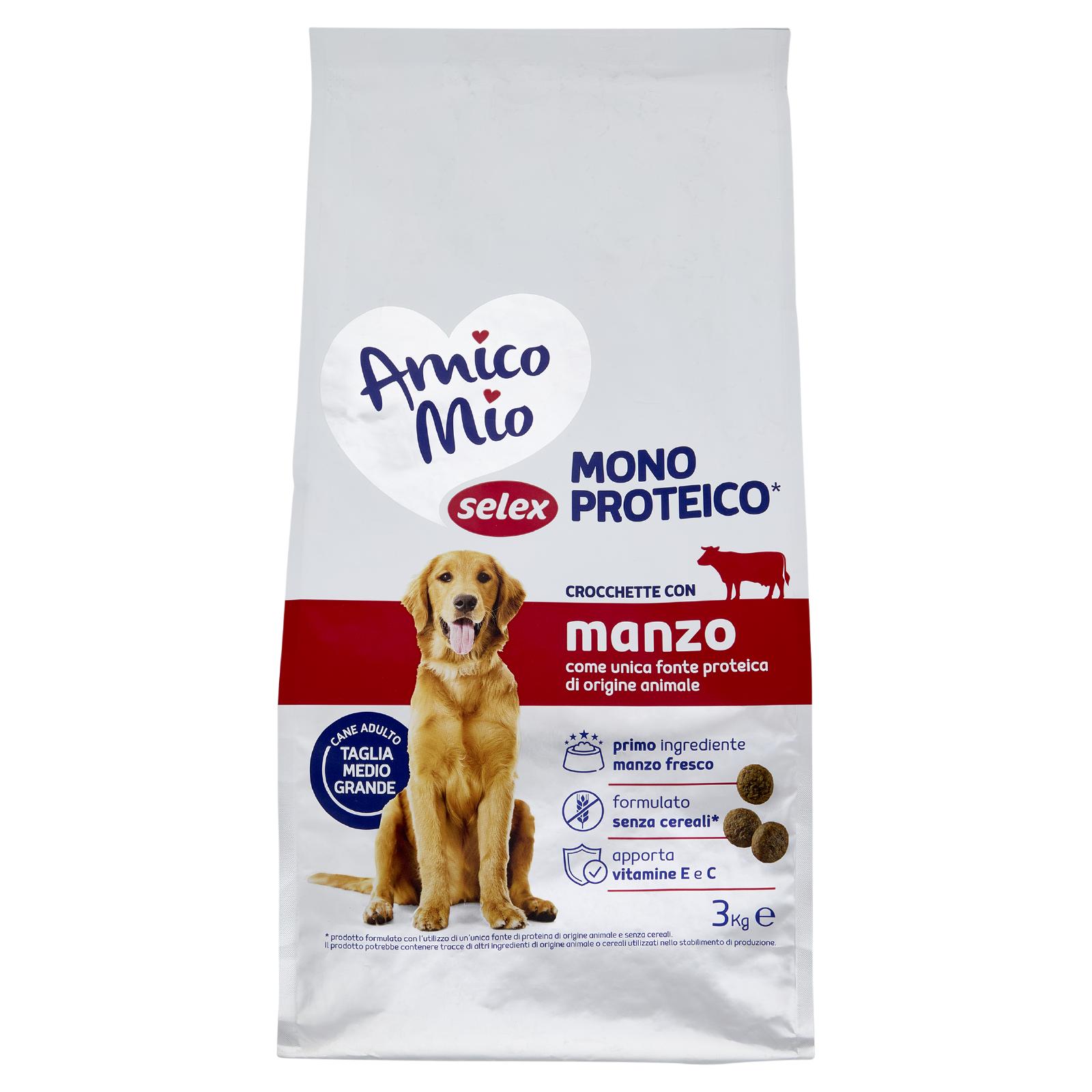 - Amico Mio Selex Mono proteico* è formulato con un'unica fonte di proteine animali e senza l'utilizzo di cereali. * prodotto formulato con l'utilizzo di un'unica fonte di proteina di origine animale e senza cereali. Il prodotto potrebbe contenere tracce di altri ingredienti di origine animale o cereali utilizzati nello stabilimento di produzione.