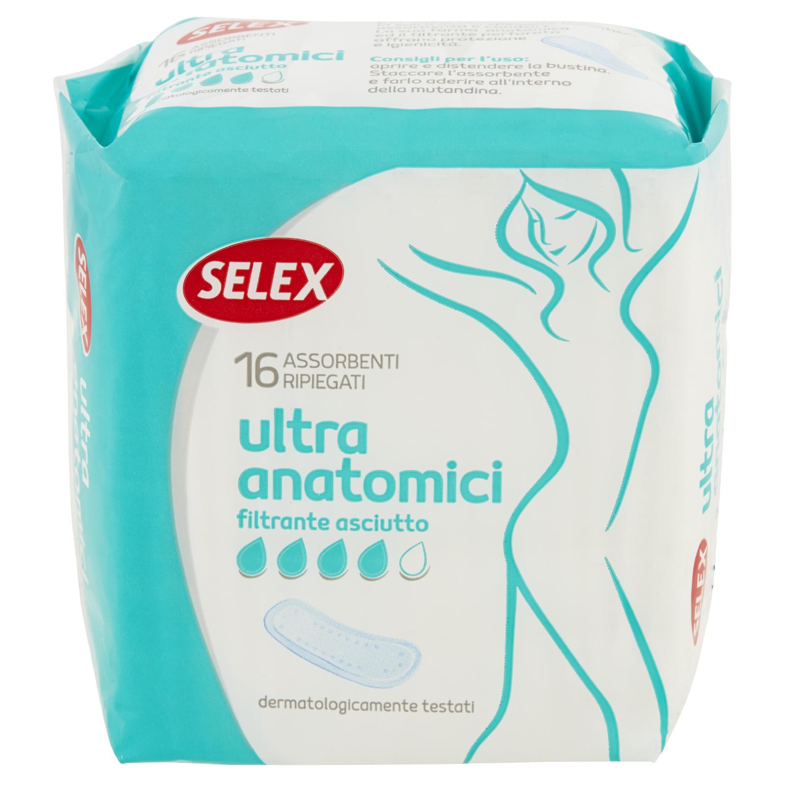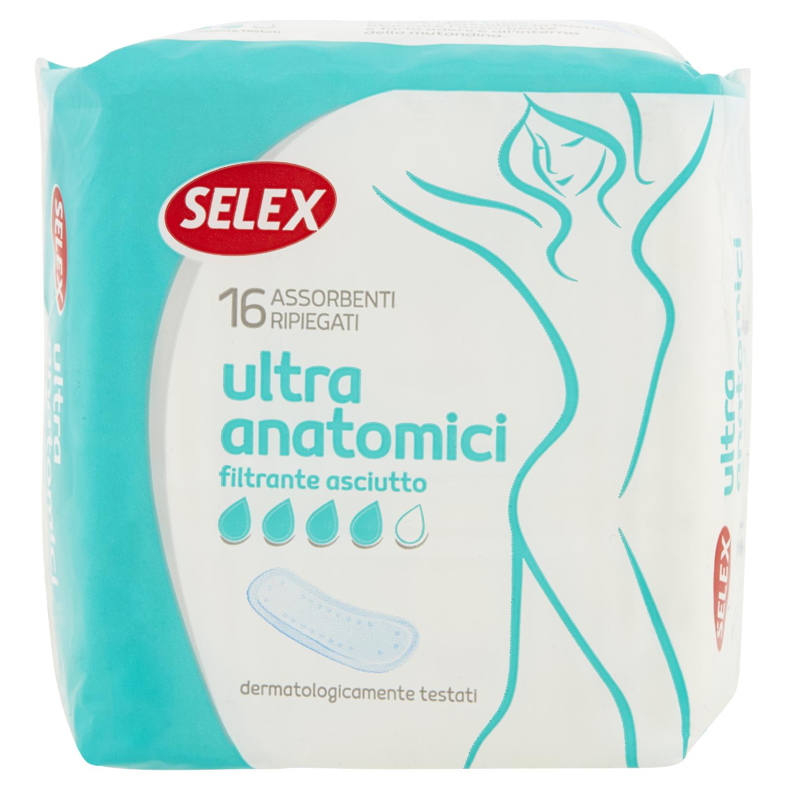 - Selex Ultra Anatomico per tutti i giorni del ciclo in soli 2 mm di spessore garantisce assorbenza e comfort. La sua forma anatomica ed il filtrante perforato offrono protezione e igienicità.
