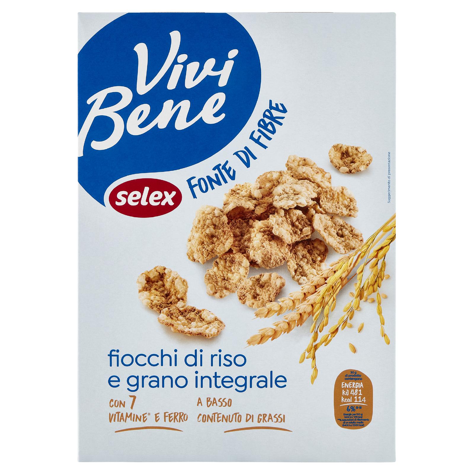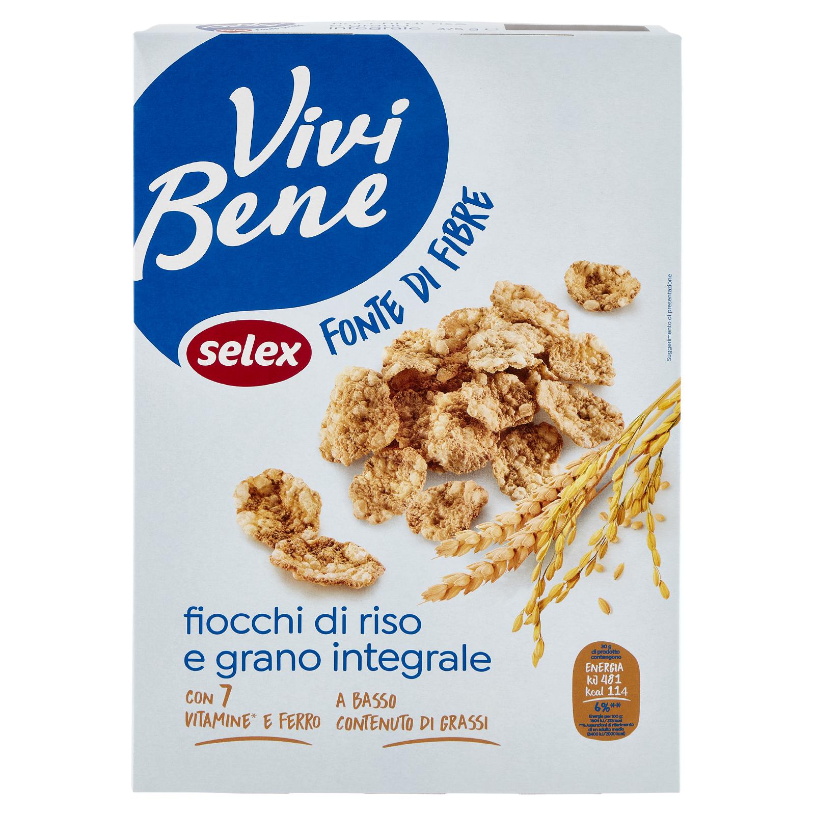 - Fiocchi di riso e grano integrale con aggiunta di vitamine* (PP, B5, B6, B2, B1, folacina, B12) e ferro
