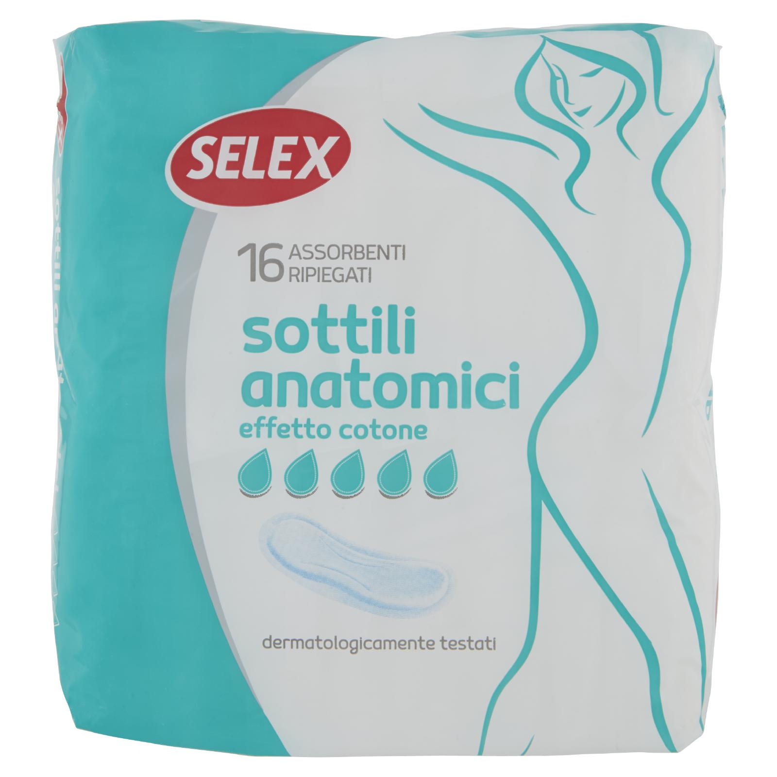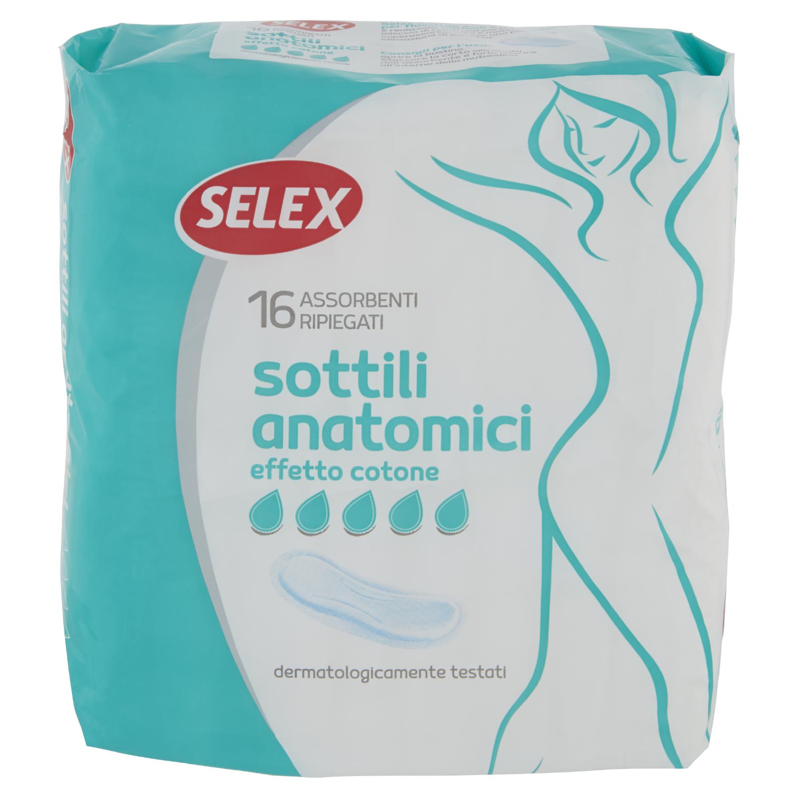 - Selex Sottile Anatomico per flussi normali e abbondanti è realizzato con una particolare miscela di cellulosa e materiale superassorbente, per una piacevole sensazione di asciutto.