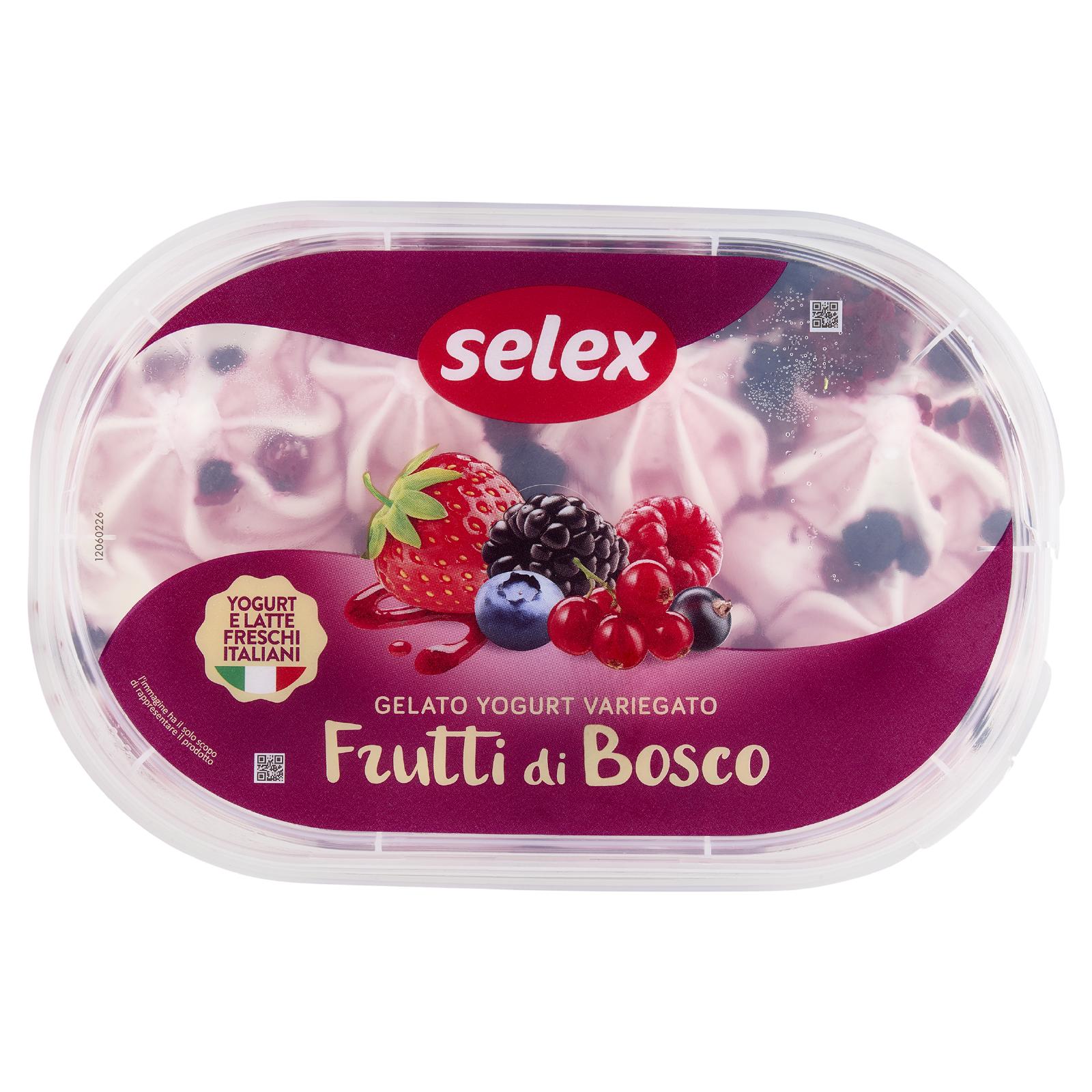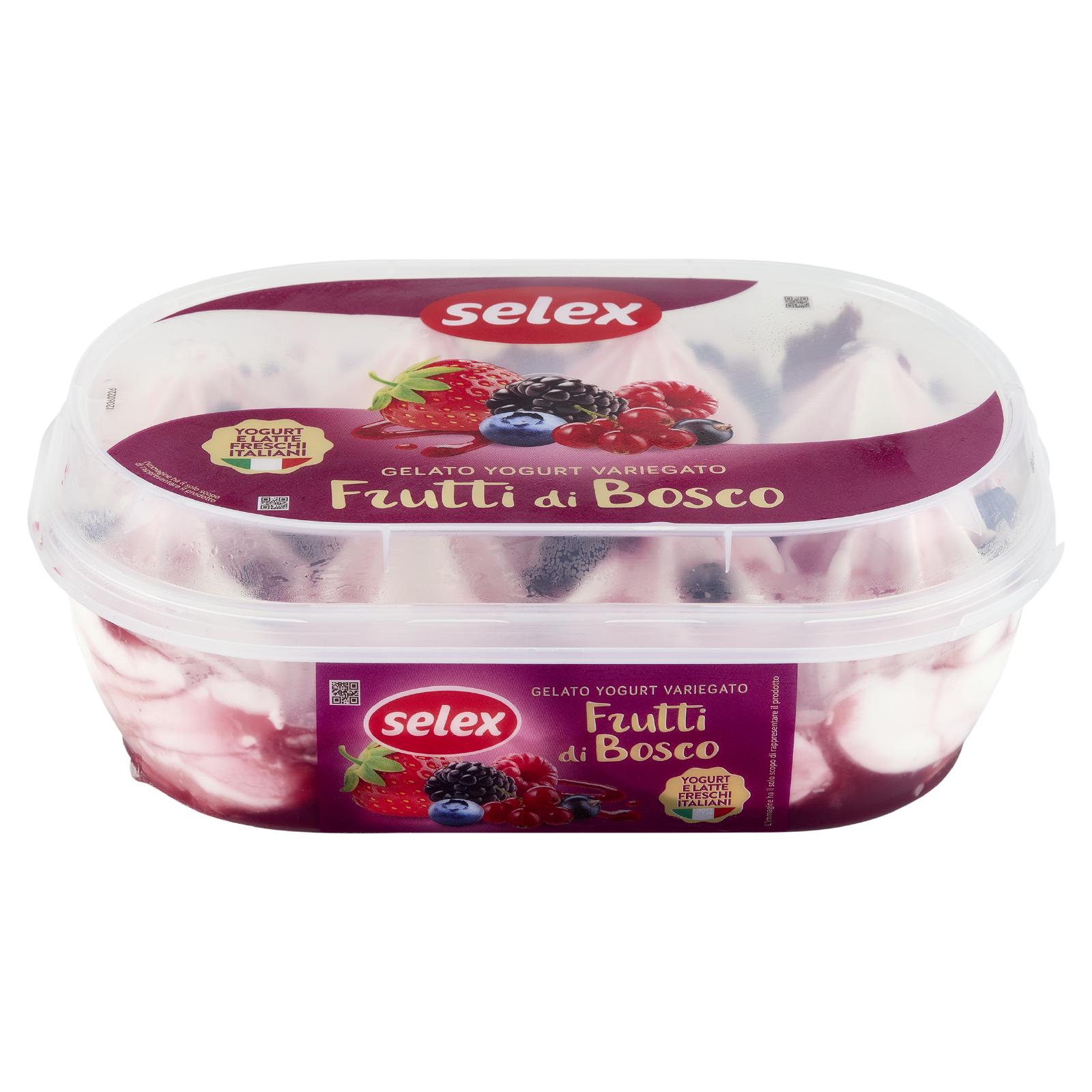 - Gelato con yogurt fresco italiano (yogurt 39% di cui 30,8% nel prodotto finito, latte scremato fresco pastorizzato italiano 27% di cui 21,6% nel prodotto finito, zucchero, sciroppo di glucosio, olio di cocco, latte scremato in polvere, emulsionanti: mono- e digliceridi degli acidi grassi; addensanti: farina di semi di carrube; gelatina alimentare, aromi) Variegatura 15,4% (succo di frutti di bosco da concentrati 40% di cui 6,2% nel prodotto finito (succhi di: fragola, ribes, lampone, mora, mirtillo), zucchero, acqua, sciroppo di glucosio, purea di fragola da concentrato 5% di cui 0,7% nel prodotto finito, addensanti: farina di semi di carrube; concentrato vegetale di barbabietole rosse, acidificanti: acido citrico, aromi) Frutti di bosco semicanditi 5% (ribes rosso, ribes nero, fragole, more, mirtillo, sciroppo di glucosio-fruttosio, zucchero, acidificante: acido citrico; conservante: sorbato di potassio) Può contenere frutta a guscio e uova Senza glutine