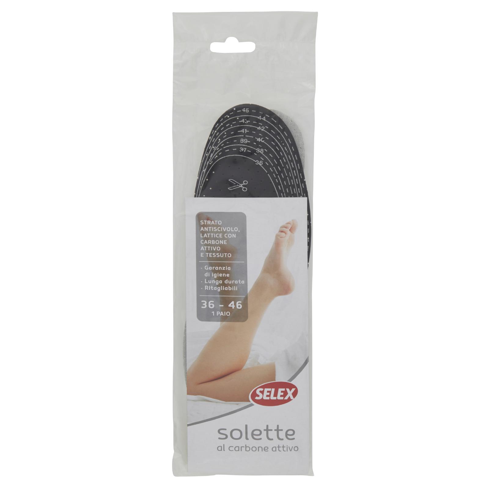 - Le solette al carbone attivo Selex, svolgono una duplice azione: assicurano più confort al piede migliorando la calzabilità della scarpa. Le solette al carbone attivo Selex godono inoltre di un trattamento antiscivolo per mantenere la posizione desiderata.