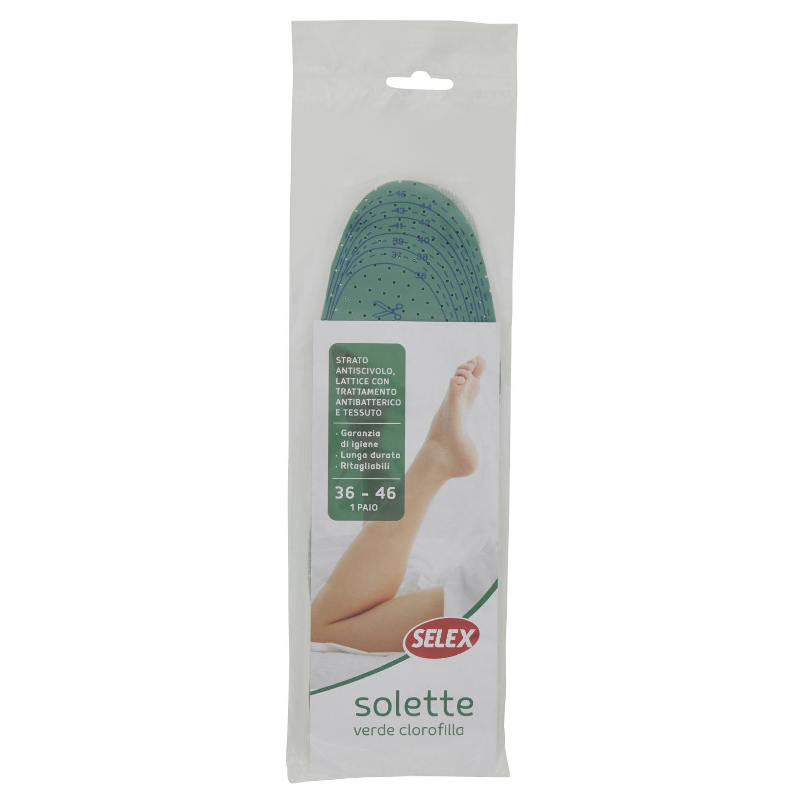 - Le solette color clorofilla Selex, in soffice schiuma di lattice, sono sottoposte a trattamento antibatterico "Sanitized". Usate ogni giorno donano relax ai piedi stanchi mantenendoli a lungo freschi e asciutti, migliorando la calzabilità della scarpa. Le solette Selex sono inoltre dotate di uno strato antiscivolo per mantenere la posizione desiderata.