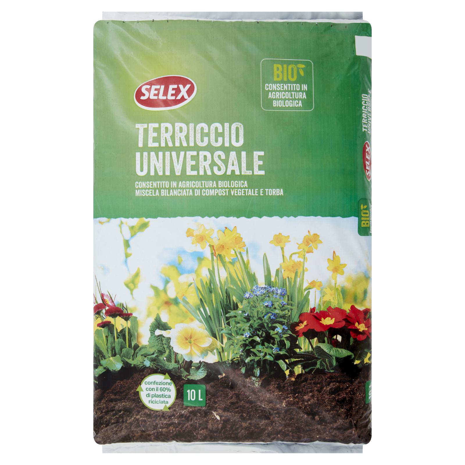 - Il Terriccio Universale Selex, è consigliato per l'impianto di tutti i tipi di piante verdi e fiorite grazie alla sua sapiente miscelazione di pregiate torbe bionde, a diverso grado di umificazione, capaci di conferire al terreno una sofficità ottimale, con ammendante compostato verde, elemento fondamentale per la crescita, lo sviluppo ed il benessere della pianta. Ricchissimo di sostanze umificate, flora microbica attiva, questo prodotto è indicato anche per la preparazione dell'orto e l'impiantazione di arbustive e piante da frutto. Grazie alla sua formula priva di reflui e fanghi industriali, è particolarmente adatto per essere utilizzato in Agricoltura Biologica. Proprietà La soffice composizione favorisce l'ancoraggio delle radici, assicurando una buona ripresa delle piante dopo il rinvaso o il trapianto. La sua buona ritenzione idrica facilita l'assimilazione dei principi nutritivi e riduce quindi il bisogno di innaffiare. Gli elementi presenti stimolano la vegetazione, in particolare il germoglio dei gambi e del fogliame.