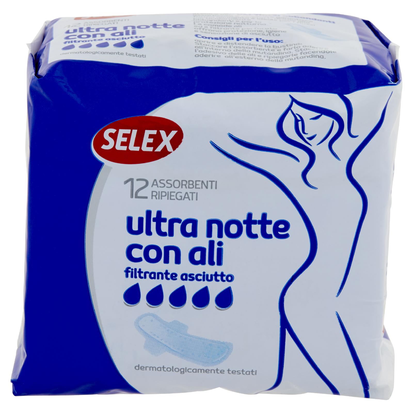 - Selex Ultra Notte più lungo per flussi abbondanti In soli 2 mm di spessore garantisce assorbenza e comfort. Grazie alla forma allungata è ideale per i flussi particolarmente abbondanti e per la protezione notturna. Le comode ali ed il filtrante perforato offrono protezione, igiene e sensazione di asciutto.