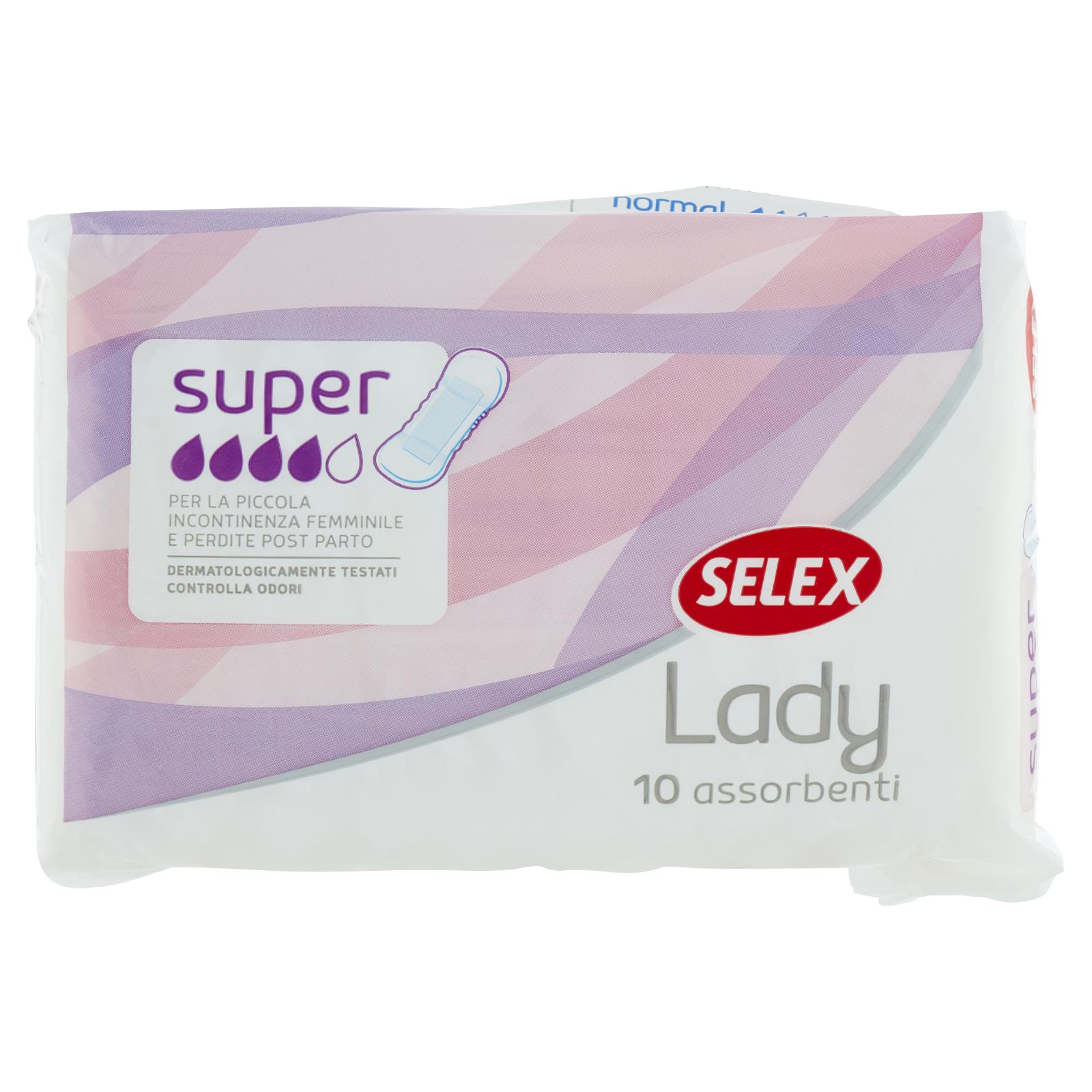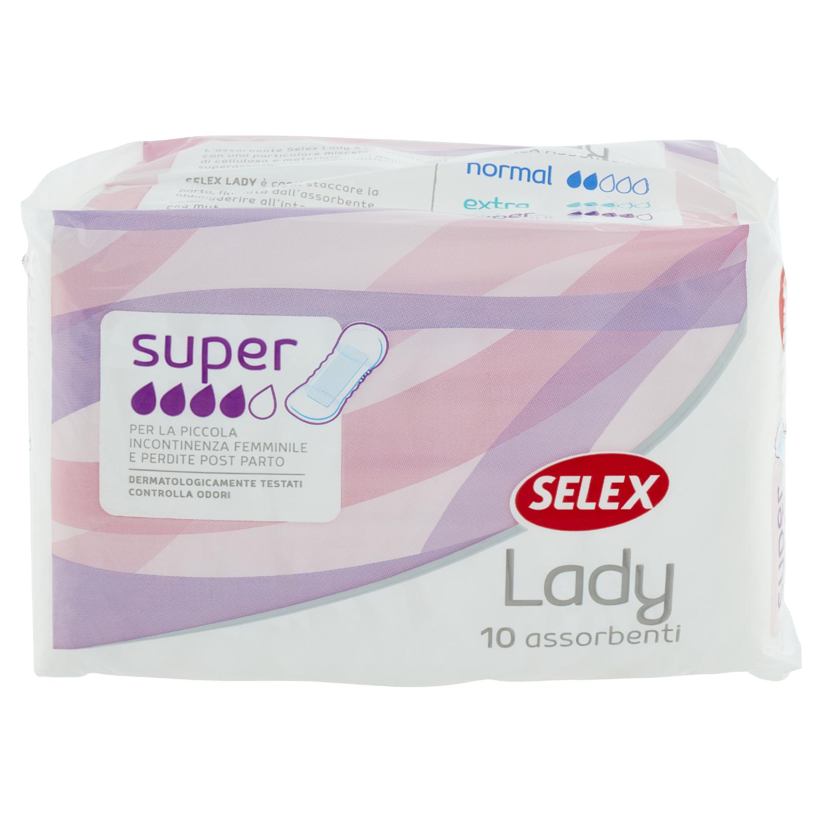- L'assorbente Selex Lady è realizzato con una particolare miscela di cellulosa e materiale superassorbente, uniti ad un doppio morbido filtrante, che garantiscono un'elevata capacità di assorbenza. Selex Lady è consigliato per la piccola incontinenza, perdite post parto, flusso mestruale molto abbondante.