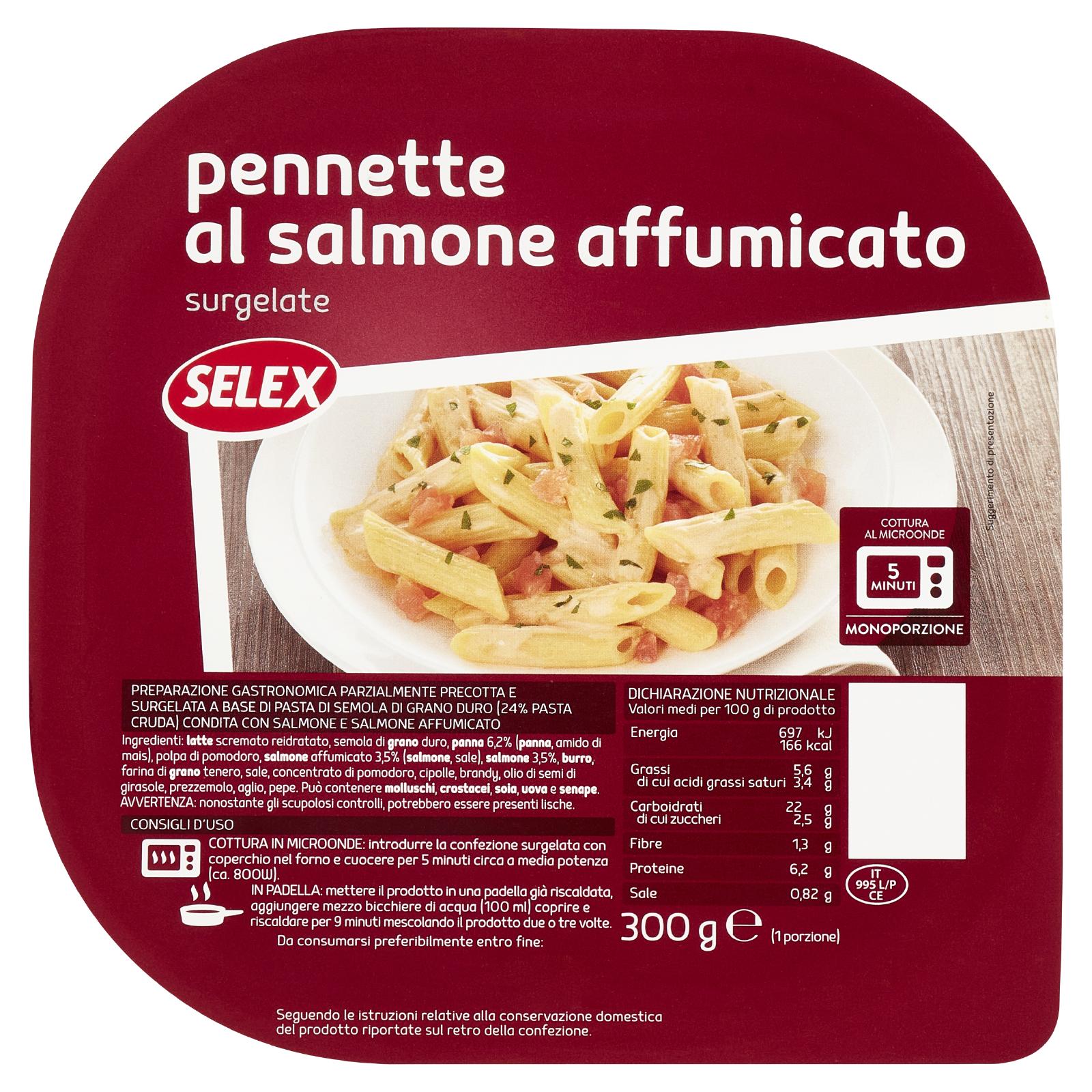 - Preparazione gastronomica parzialmente precotta e surgelata a base di pasta di semola di grano duro (24% pasta cruda) condita con salmone e salmone affumicato