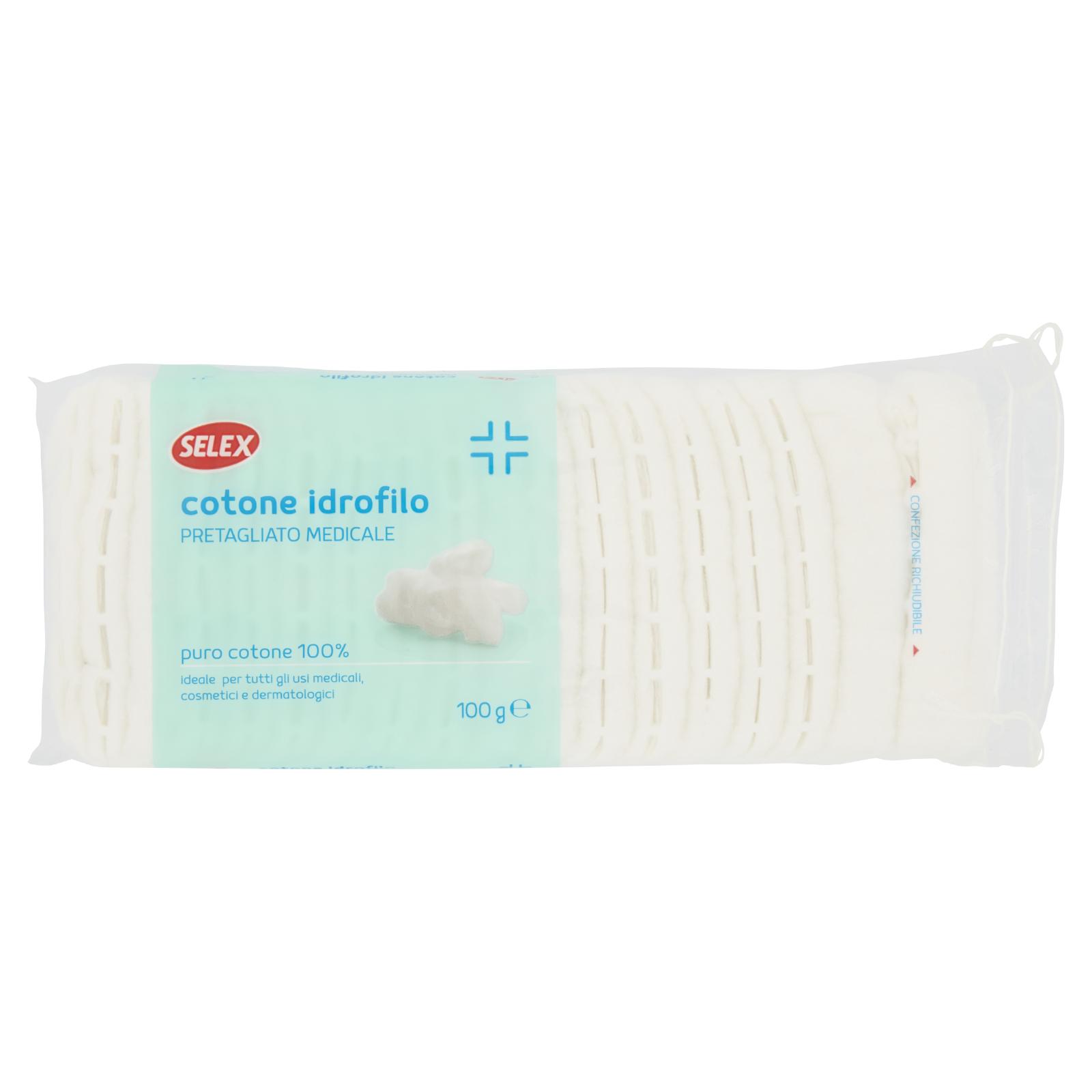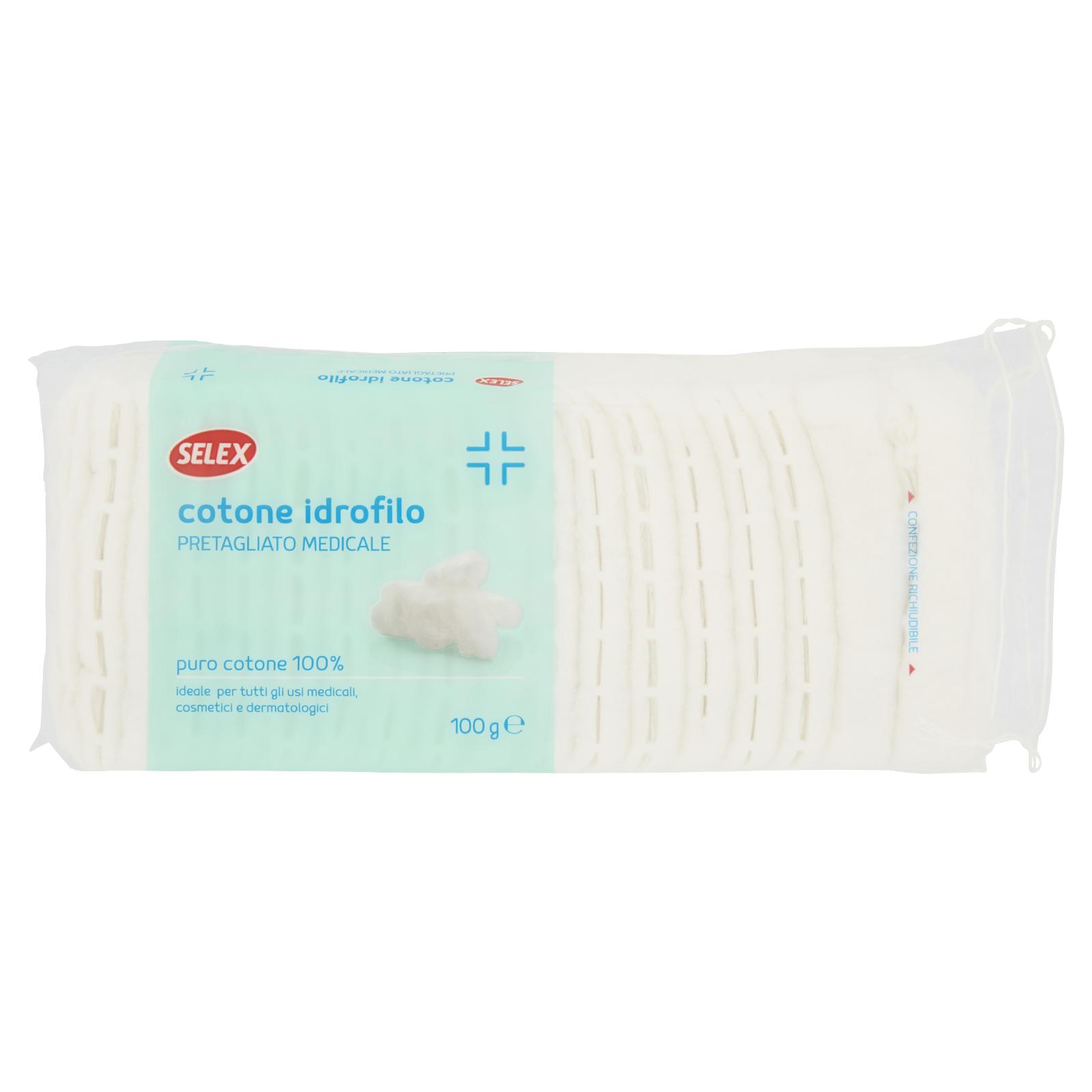 - Il Cotone idrofilo pretagliato medicale Selex è un prodotto morbido costituito esclusivamente da fibre di puro cotone sbiancato con acqua ossigenata anziché cloro o altri candeggianti ottici artificiali per un maggiore rispetto dell'ambiente. Ha un elevato potere assorbente. Conforme alle norme della Farmacopea Ufficiale.