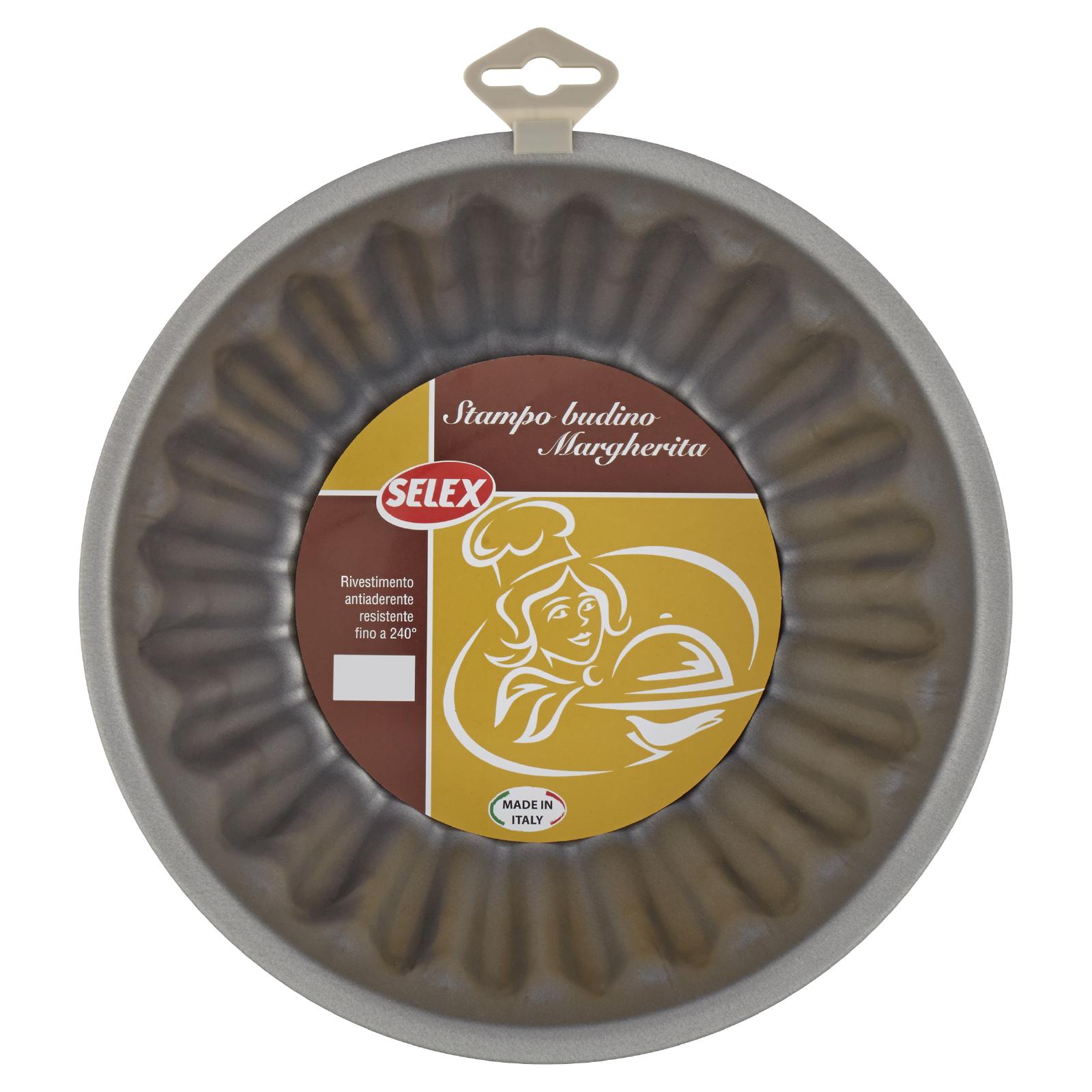 - Stampo budino Margherita: Lo stampo per budino Margherita Selex è realizzato in acciaio con rivestimento antiaderente. Grazie alla conducibilità dell'acciaio ed al basso spessore, la cottura in forno risulta rapida ed uniforme. Il rivestimento antiaderente assicura ottimi risultati di sfornatura del dolce. Facile da pulire dopo l'utilizzo.