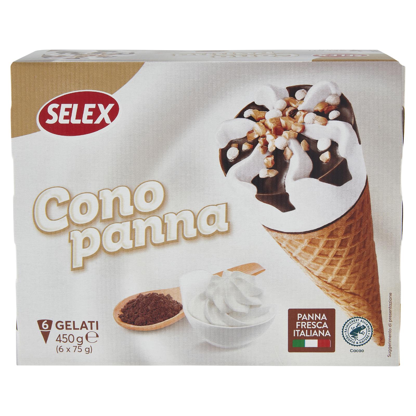 - 6 Coni di gelato con panna con copertura al cacao magro, decorato con granella di nocciola tostata e meringhe