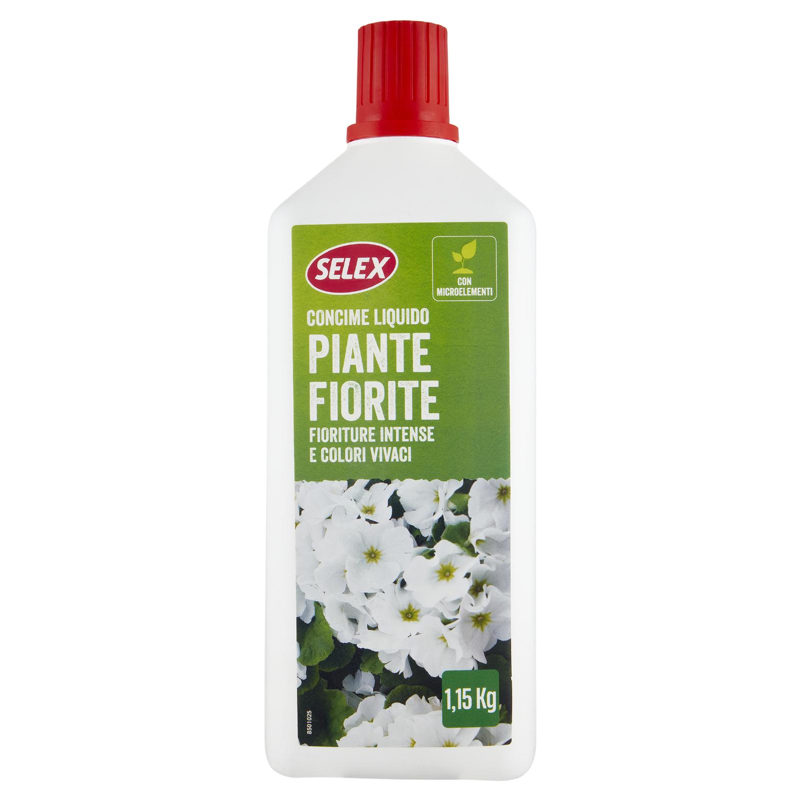 - Il Concime Liquido Piante Fiorite Selex è appositamente studiato per apportare una nutrizione bilanciata ai gerani e a tutte le piante da fiore annuali, biennali e perenni coltivate in vaso in casa, balcone, giardino. La presenza di microelementi favorisce fioriture abbondanti, continue e dai colori intensi.