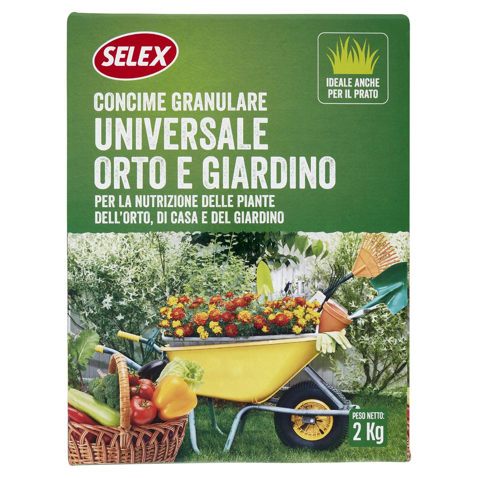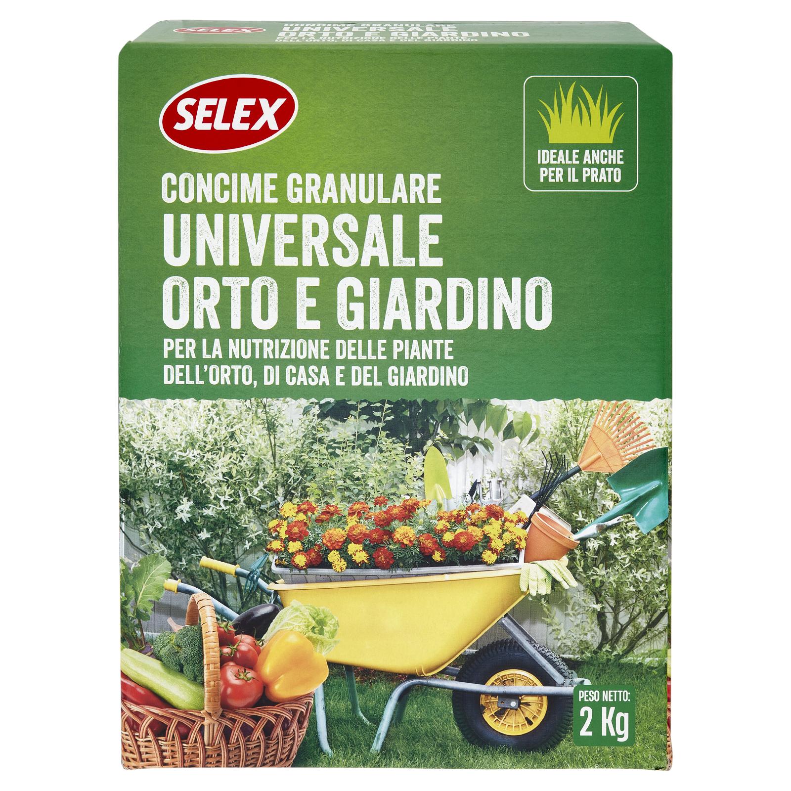 - Il Concime Granulare Universale Orto e Giardino Selex, ha larghissima destinazione d'uso in grado di fornire a ogni tipo di pianta il necessario e giusto apporto nutritivo, favorendo una crescita omogenea e bilanciata. È ideale da utilizzare su orti, aiuole da fiore, cespugli, siepi, piante da frutta, alberi ornamentali, conifere, prati; può essere utilizzato per la concimazione di pre-semina (2-3 settimane prima della semina interrandolo durante la preparazione del terreno) e per la concimazione di copertura, a intervalli variabili a seconda della coltura e del tipo di terreno.