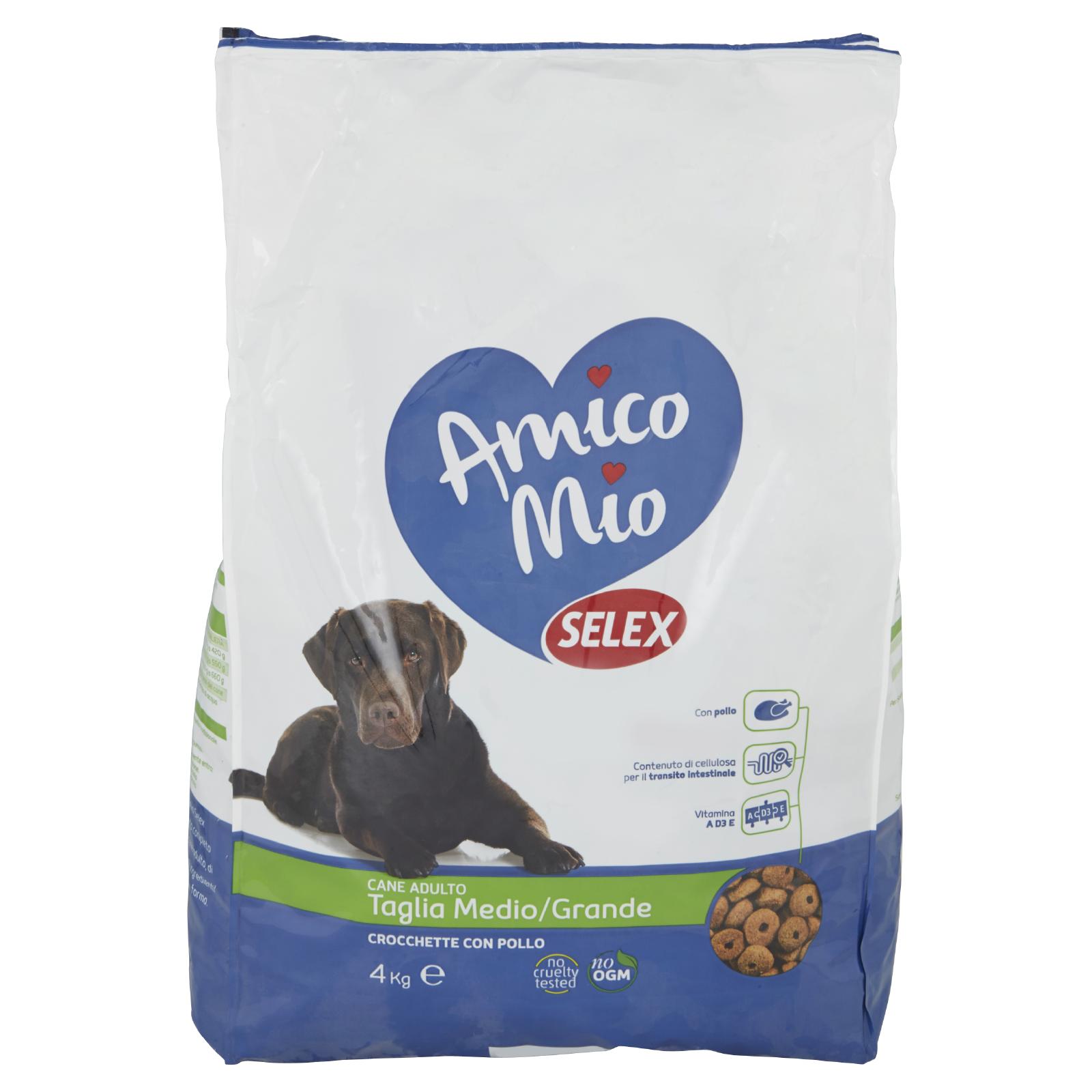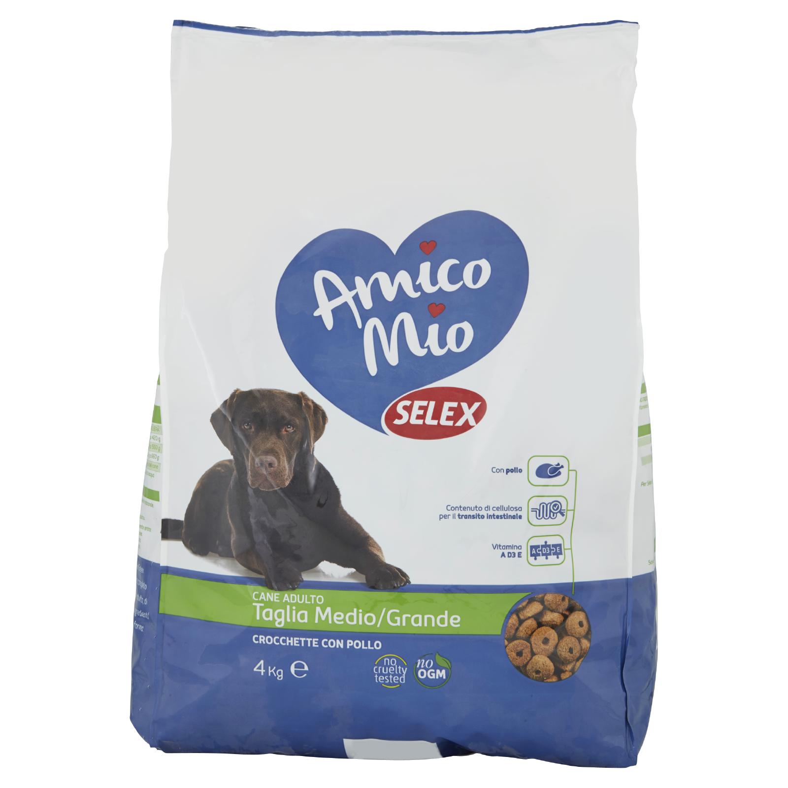 - Le crocchette Amico Mio Selex rappresentano un alimento completo in grado di offrire al tuo cane adulto, di medio-grande taglia, tutti gli ingredienti necessari per mantenerlo in forma.