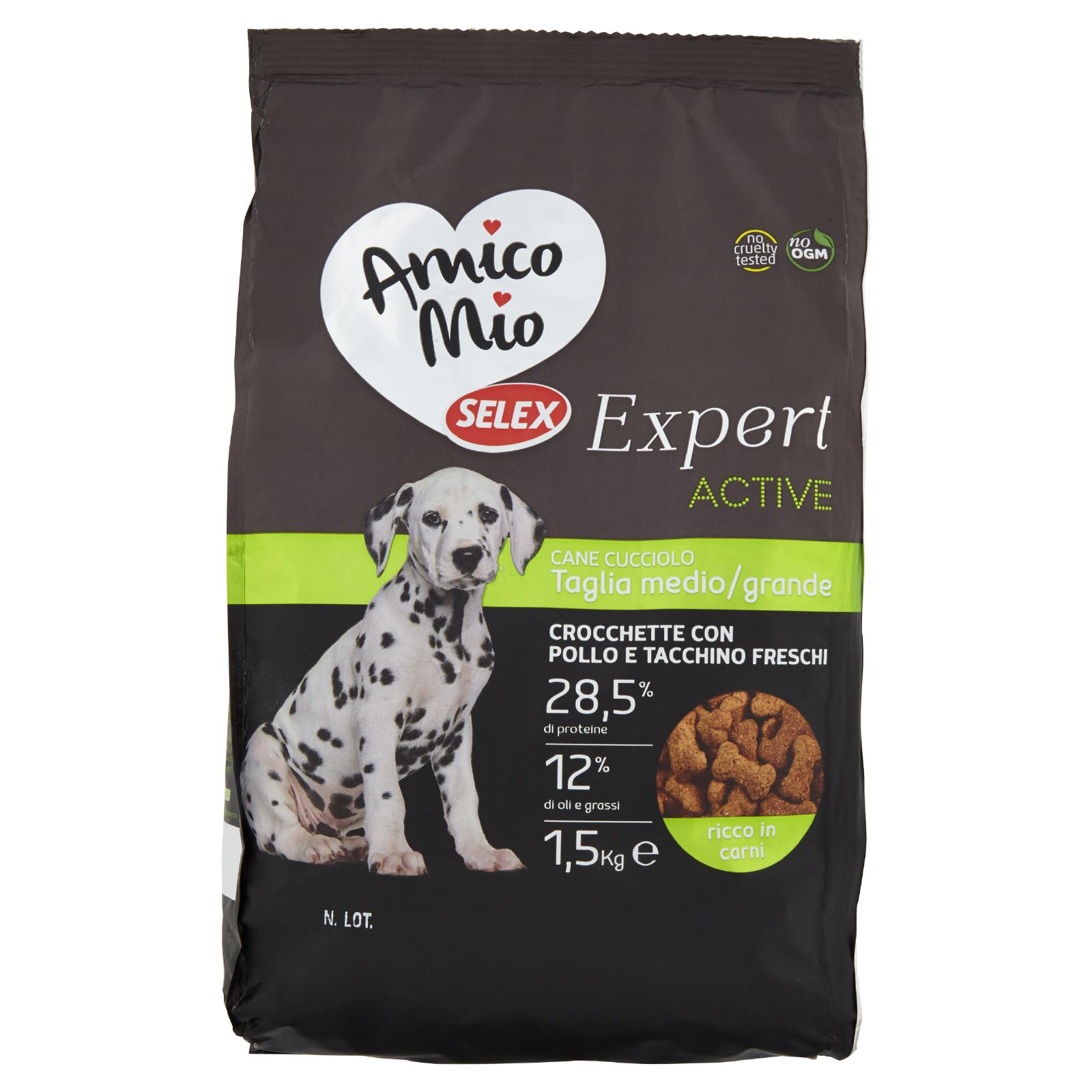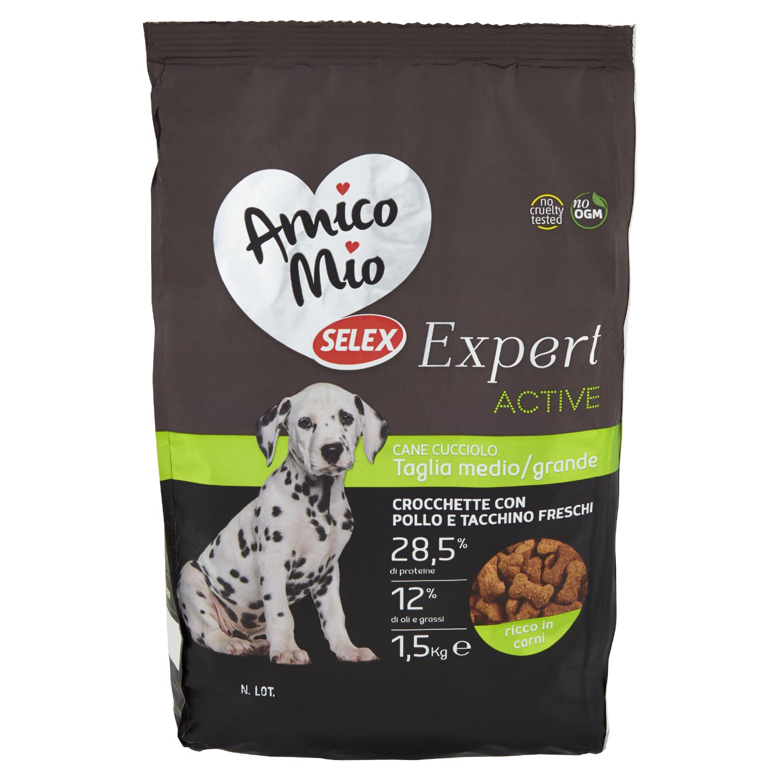 - Amico Mio Selex Expert Junior è un alimento per cuccioli di media e grande taglia in fase di crescita (2-12 mesi di età). Accompagna la crescita del tuo cane con ingredienti funzionali, gli oligoelementi indispensabili per il suo metabolismo.