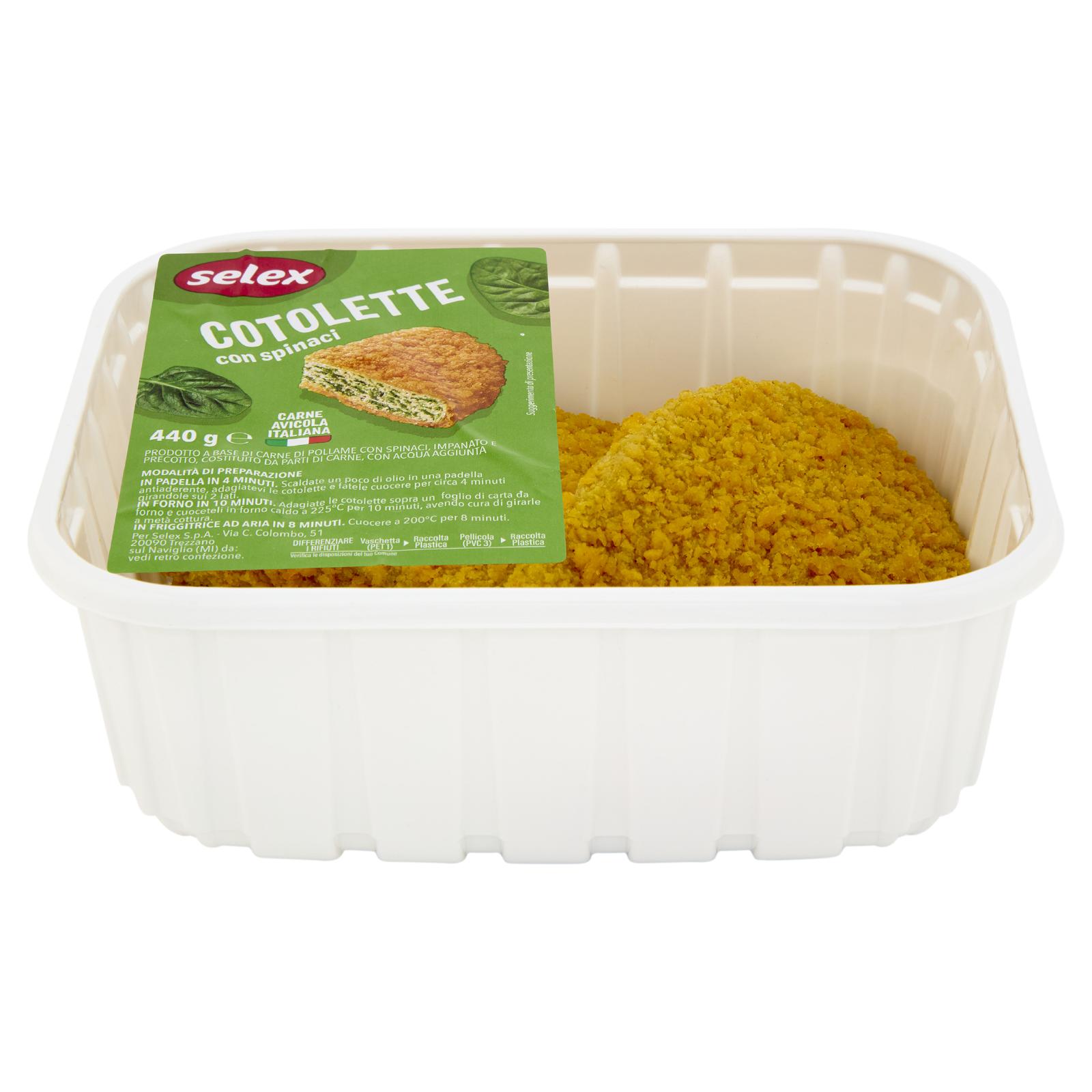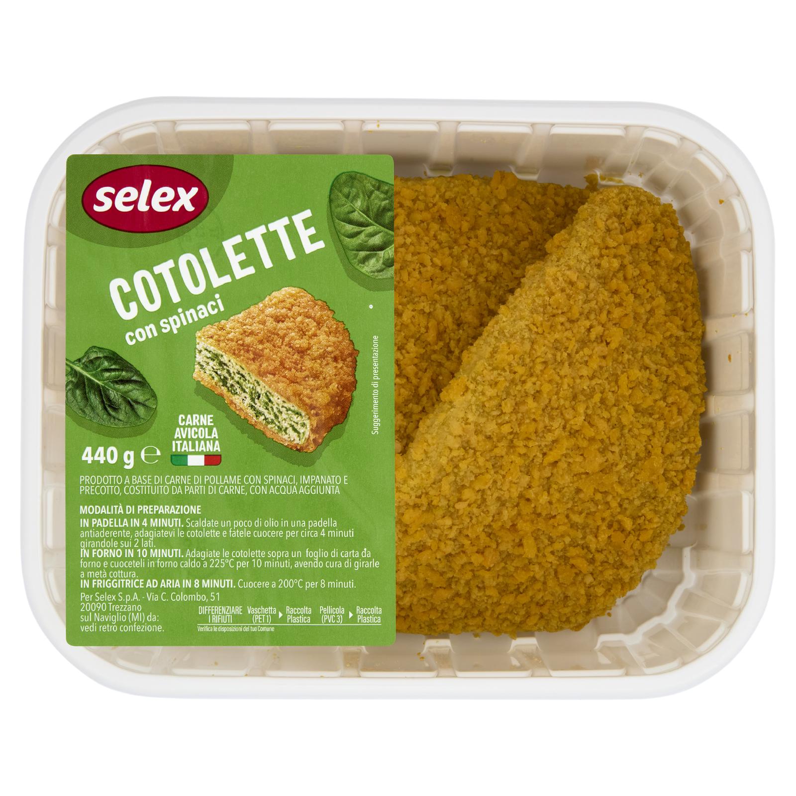 - Coltoletta con spinaci Prodotto a base di carne di pollame con spinaci impanato e precotto, costituito da parti di carne, con acqua aggiunta