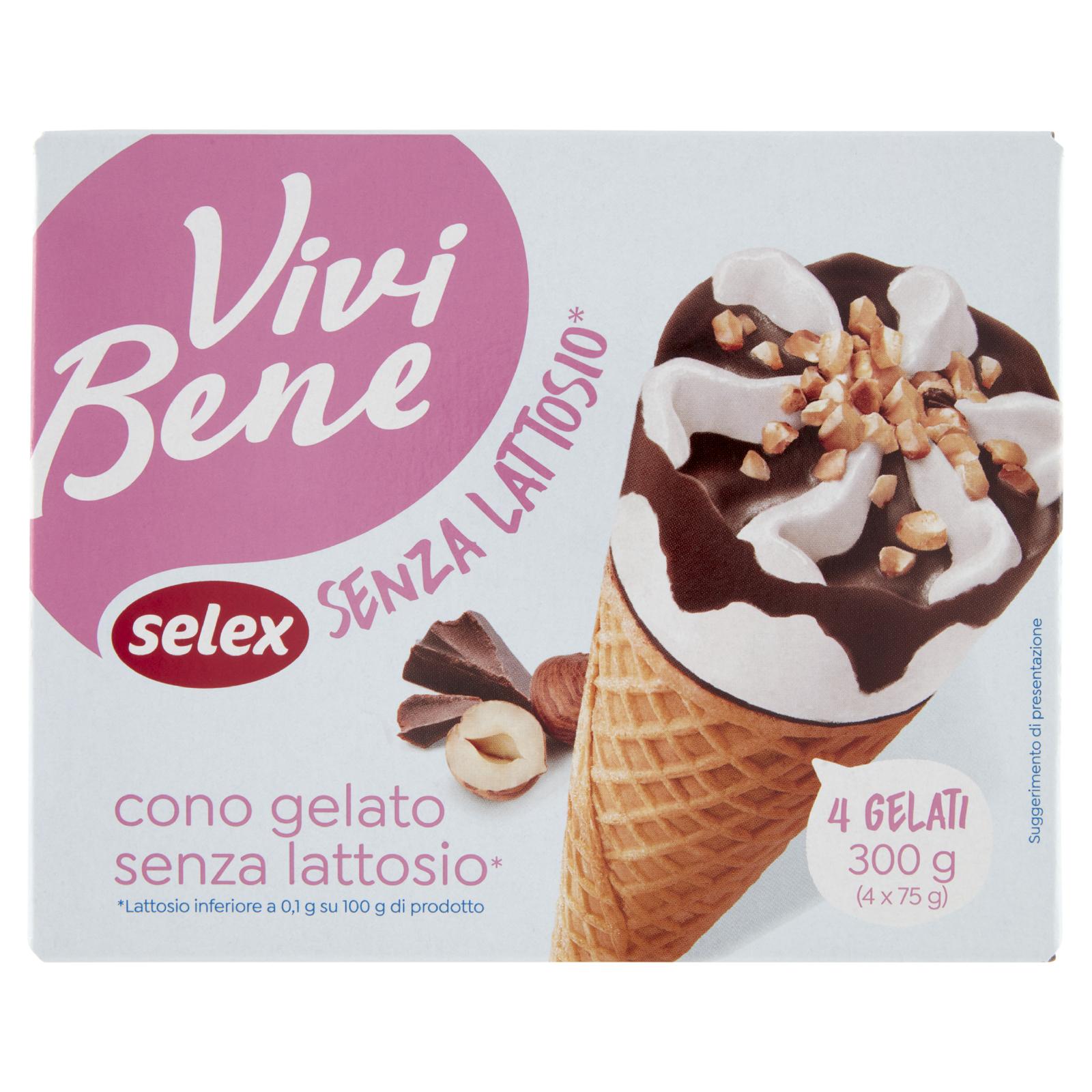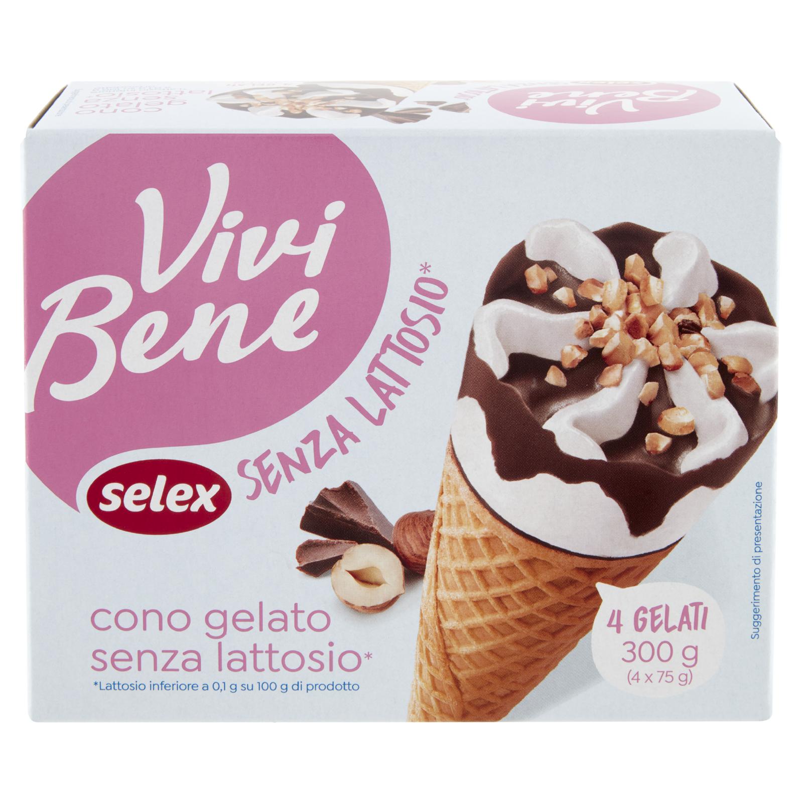 - Cono di cialda 15% con gelato al gusto latte, granella di nocciole 2% e copertura al cioccolato fondente 15%. Senza lattosio. Lattosio inferiore a 0,1 g su 100 g. Il prodotto contiene glucosio e galattosio in conseguenza della scissione del lattosio