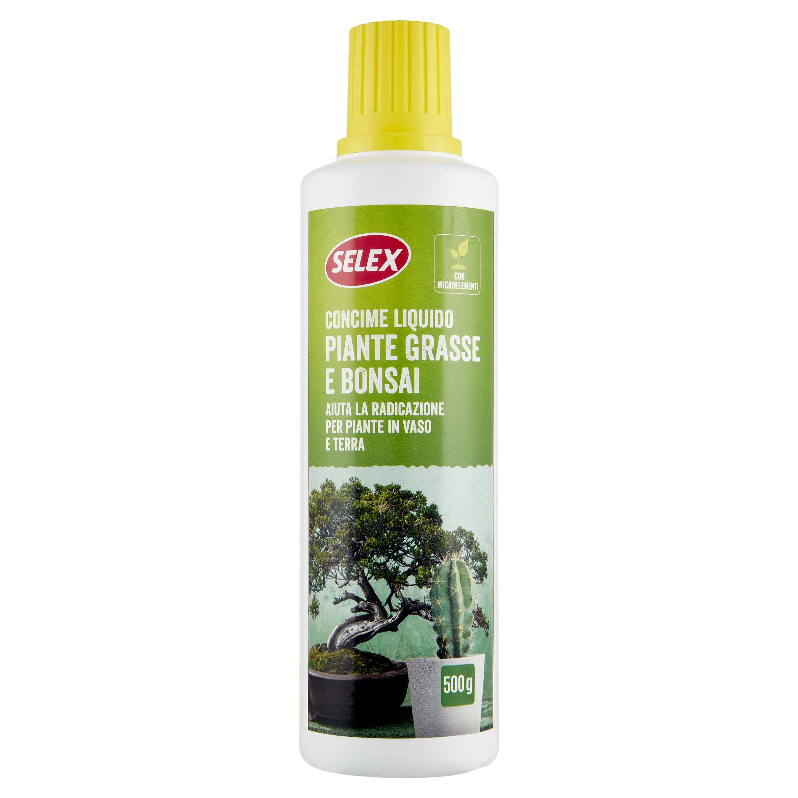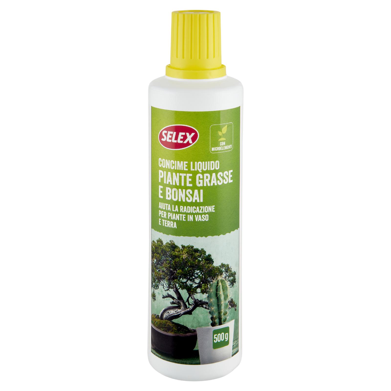 - Il Concime Liquido Piante Grasse e Bonsai Selex è appositamente studiato per apportare un nutrimento equilibrato a piante grasse, cactacee e bonsai, sia in casa che in giardino. La presenza di microelementi favorisce un ottimo sviluppo all'apparato radicale, caratteristica necessaria per queste tipologie di piante. La sua formula rende le piante più resistenti alle avversità.