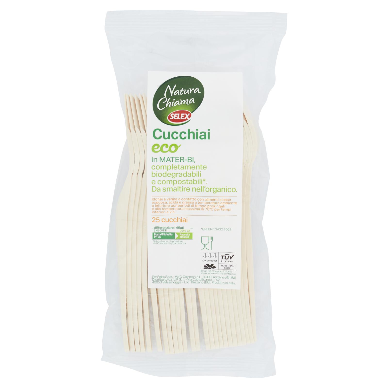 - Cucchiai eco In Mater-Bi, completamente biodegradabili e compostabili*. Da smaltire nell'organico. *UNI EN 13432:2002