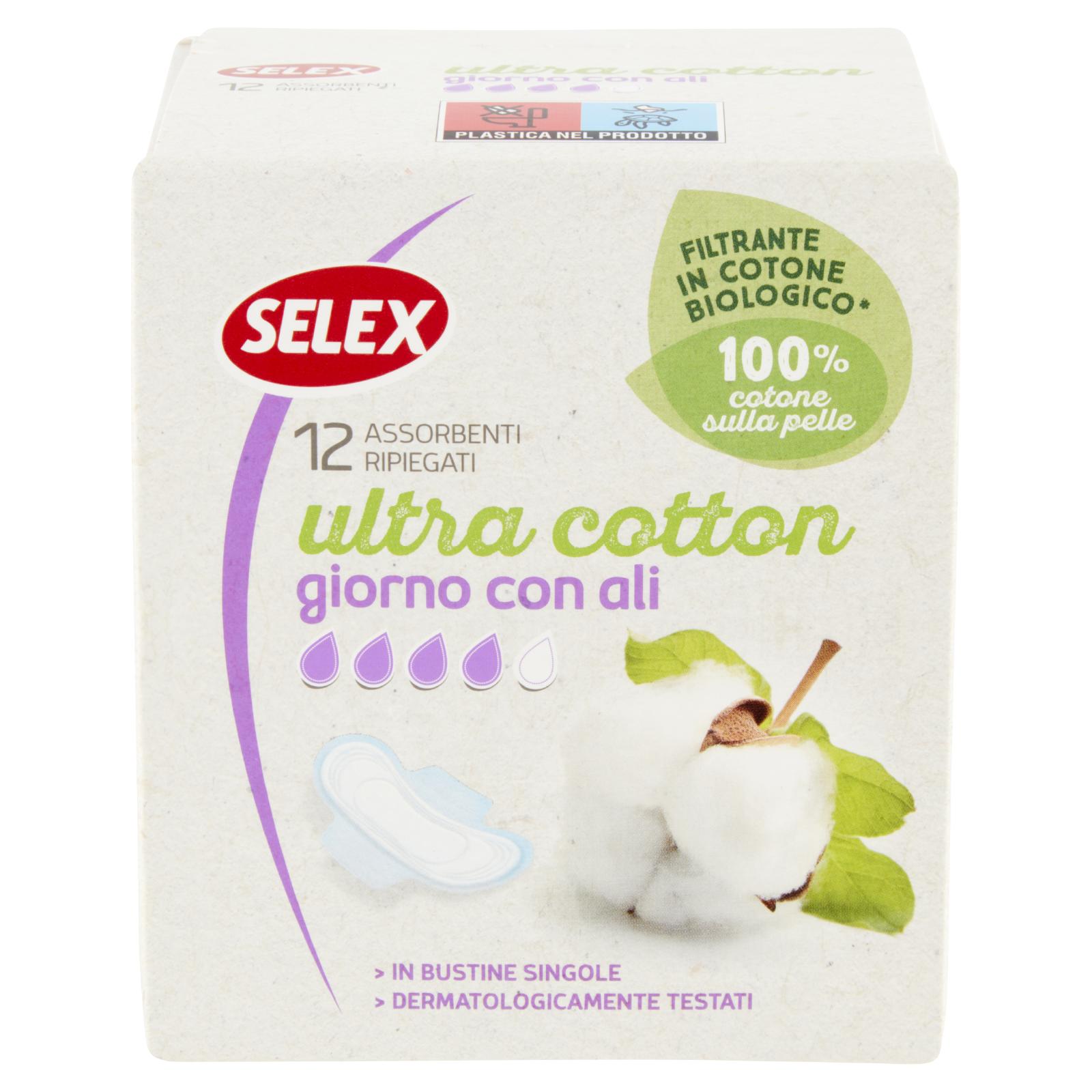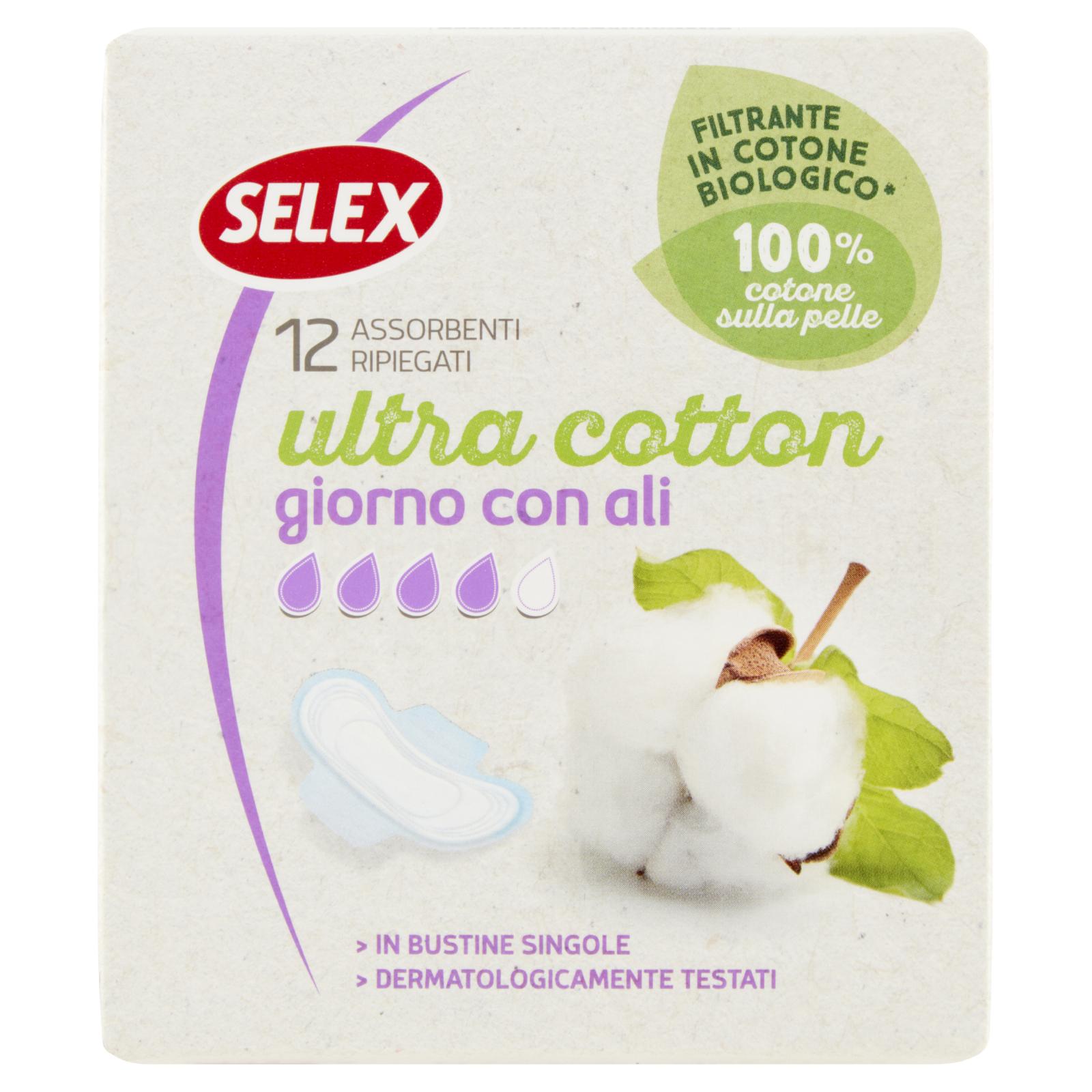 - Filtrante 100% in cotone per un contatto della pelle con una materia prima naturale Cuore assorbente con tecnologia multistrato e a componenti selezionate per garantire un'ottima assorbenza. Gli assorbenti Selex Ultra Cotton Giorno con ali con filtrante in cotone biologico sono ideali durante tutto il ciclo specialmente per chi preferisce il contatto della propria pelle con una materia prima naturale. Grazie alla tecnologia multistrato e a componenti selezionate per la loro capacità di assorbenza, offrono protezione e igienicità.