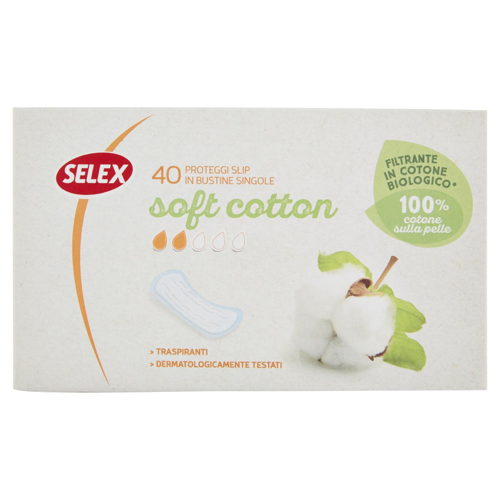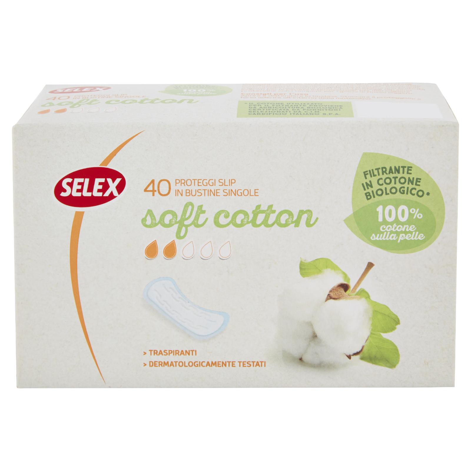 - Filtrante 100% in cotone per un contatto della pelle con una materia prima naturale Cuore assorbente a componenti selezionate per garantire un'ottima protezione. I Proteggi slip Selex Soft Cotton con filtrante in cotone biologico sono pensati per chi preferisce il contatto della propria pelle con una materia prima naturale. Traspiranti, sono ripiegati in bustine singole che ti assicurano praticità e igiene per l'uso anche fuori casa. I proteggi slip sono indicati per le perdite intermestruali, per una migliore protezione con i tamponi, per i giorni di flusso leggero.