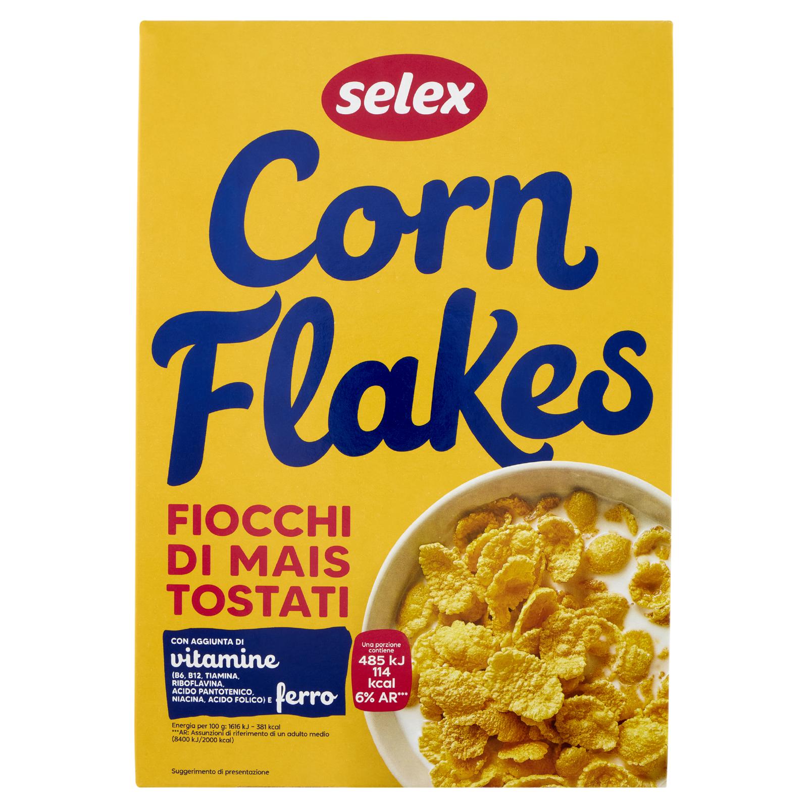 - Fiocchi di mais tostati con aggiunta di vitamine (B6, B12, tiamina, riboflavina, acido pantotenico, niacina, acido folico) e ferro