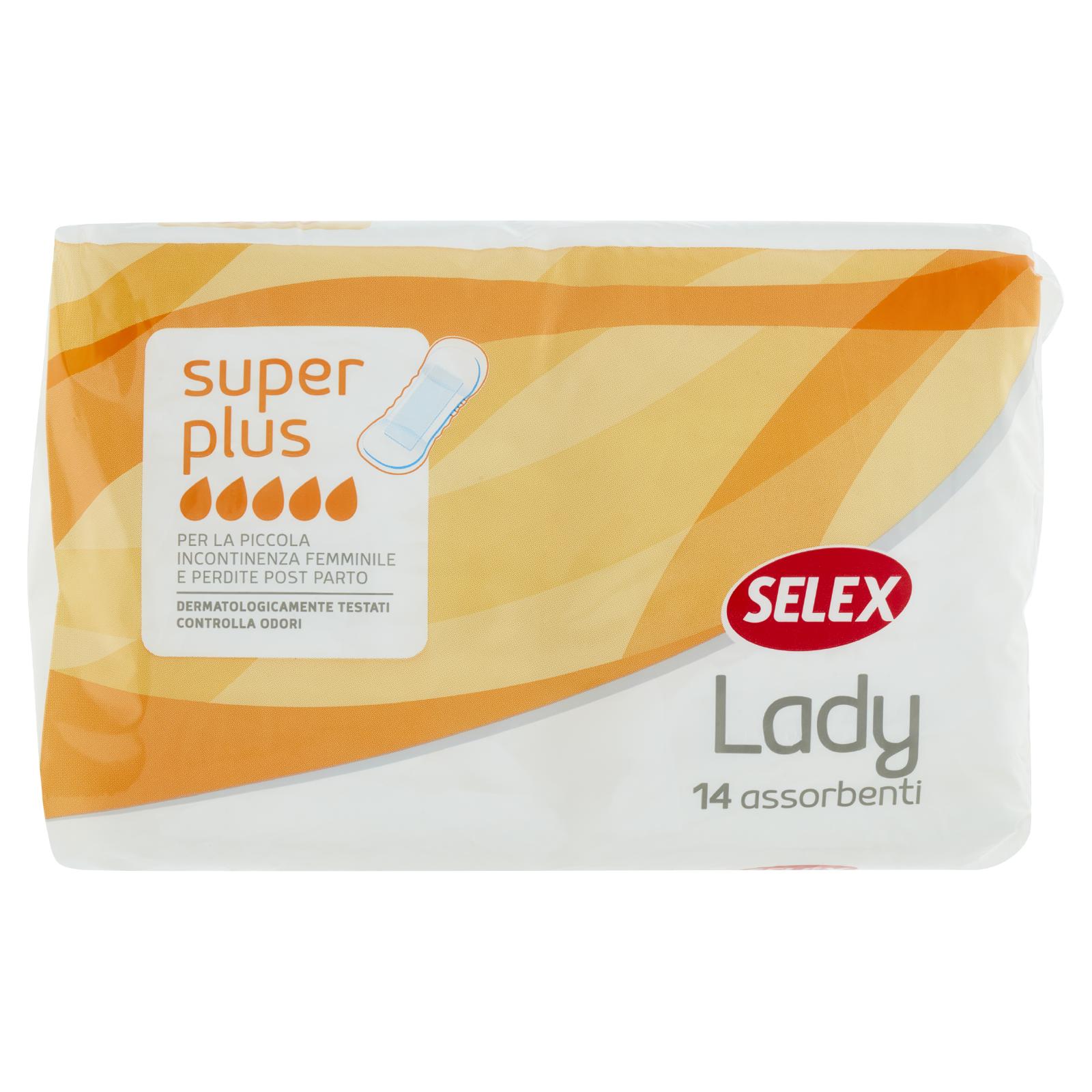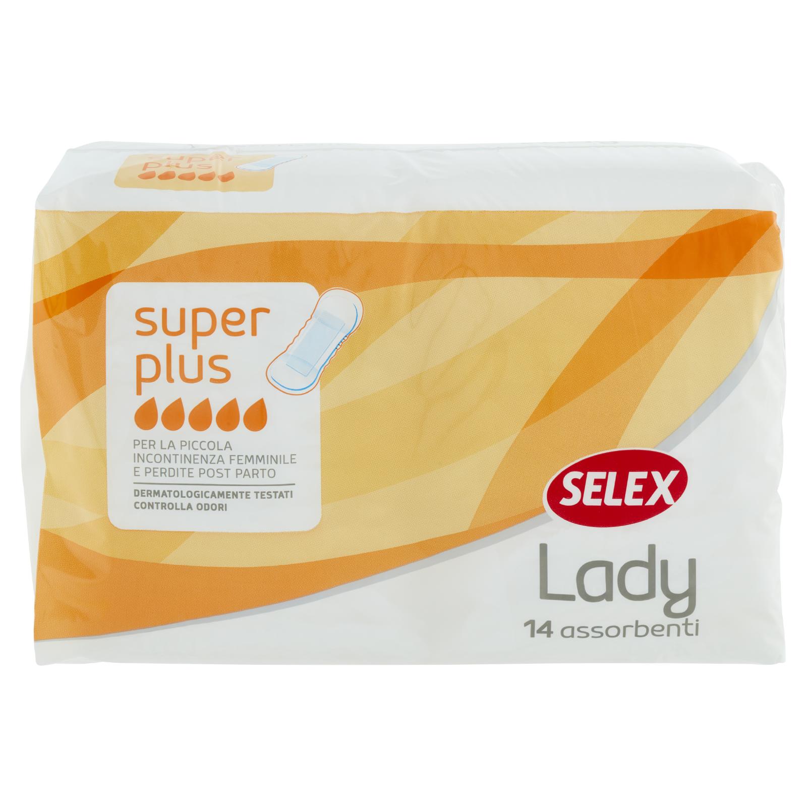 - L'assorbente Selex Lady Super Plus è realizzato con una particolare miscela di cellulosa e materiale superassorbente, uniti ad un doppio morbido filtrante, che garantiscono un'elevata capacità di assorbenza. Selex Lady è consigliato per la piccola incontinenza, perdite post parto, flusso mestruale molto abbondante.