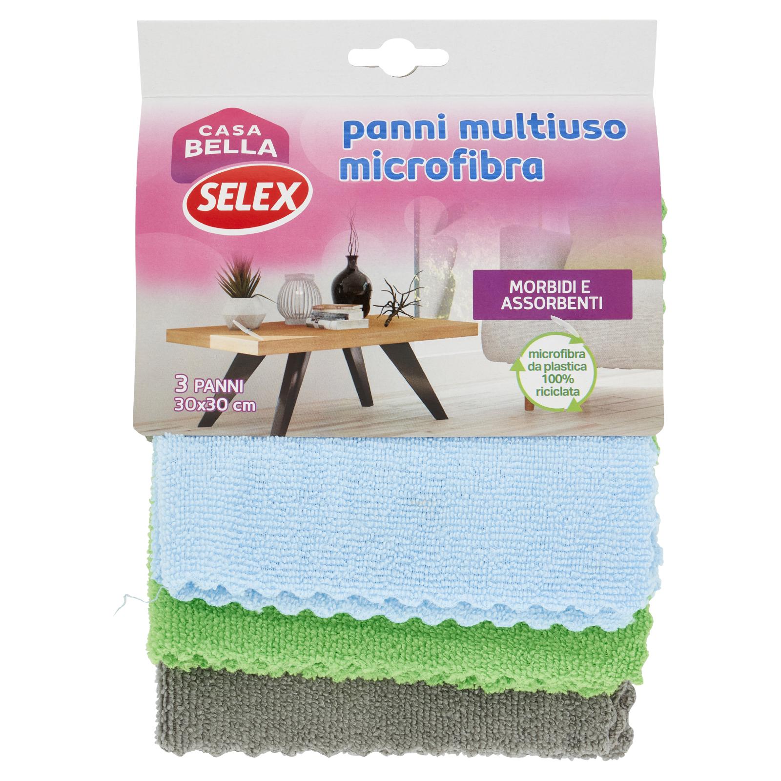 - I Panni in Microfibra Casa Bella Selex sono realizzati con fibre completamente riciclate dalla raccolta differenziata delle bottiglie. I panni garantiscono un'elevata capacità pulente ed assorbente, rimuovono il grasso e l'unto dalle superficie anche senza l'ausilio di detergenti. Sono adatti per ogni tipo di superficie.