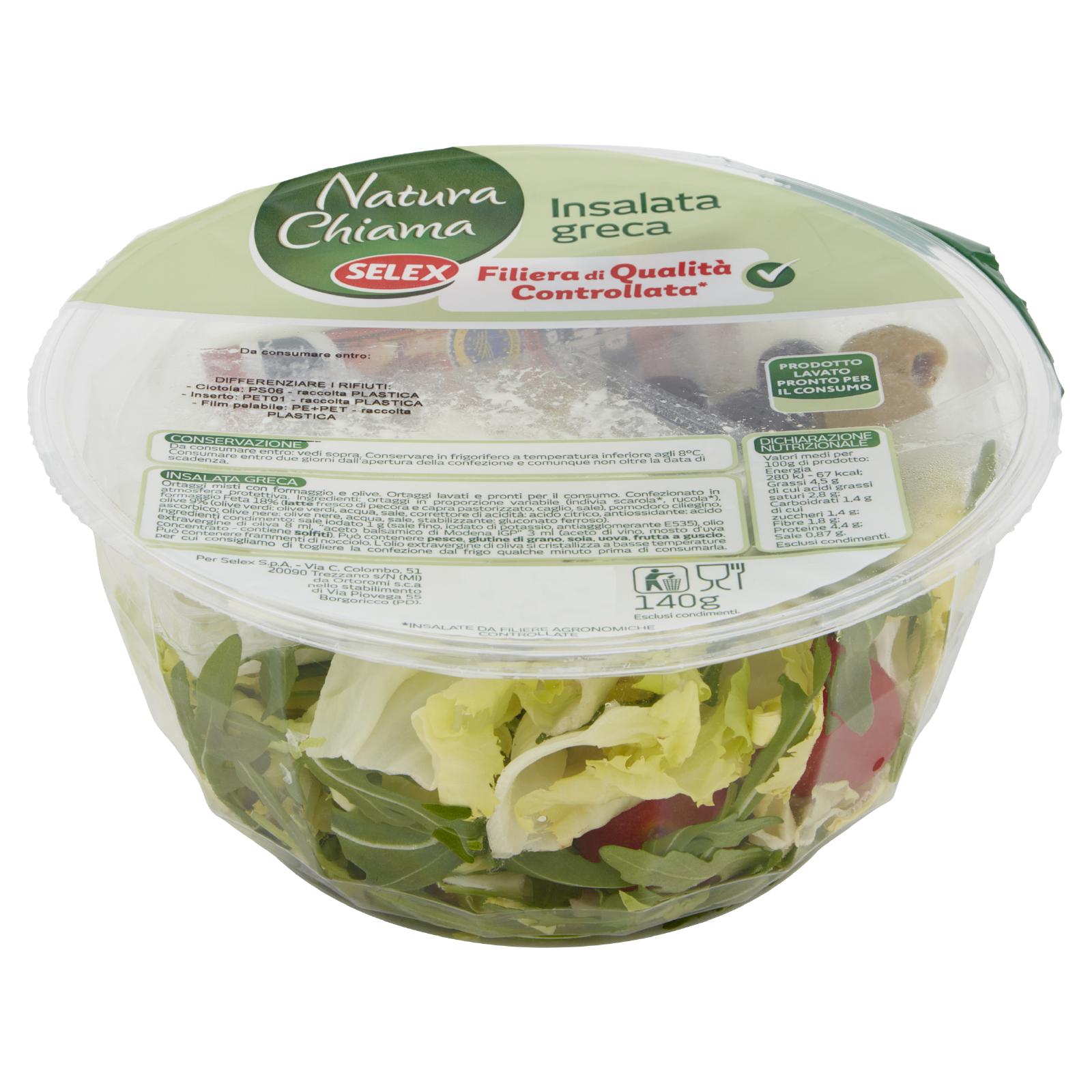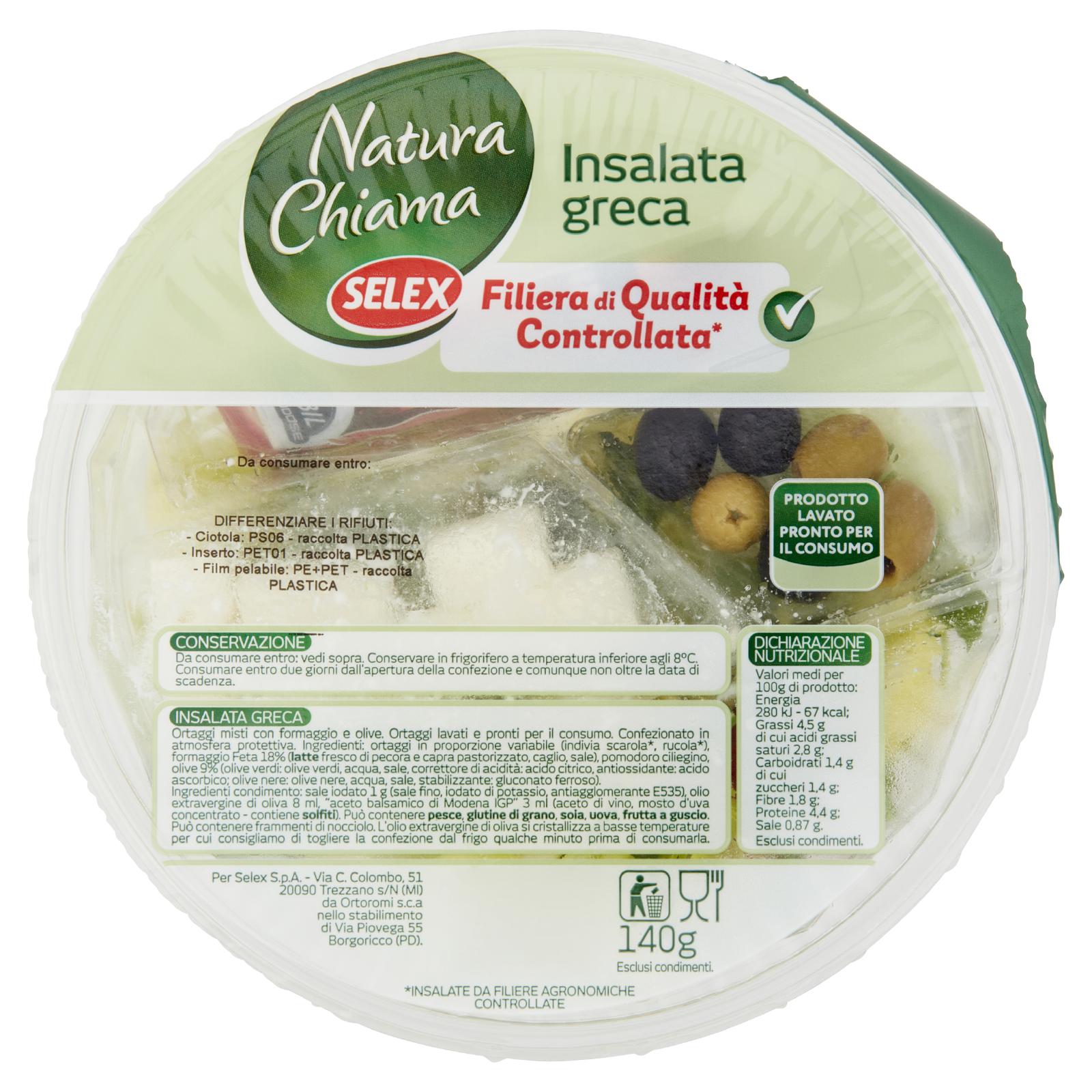 - Ortaggi in proporzione variabile (indivia scarola*, rucola*) Formaggio Feta 18% (latte fresco di pecora e capra pastorizzato, caglio, sale) Pomodoro ciliegino Olive 9% (olive verdi: olive verdi, acqua, sale, correttore di acidità: acido citrico, antiossidante: acido ascorbico; olive nere: olive nere, acqua, sale, stabilizzante: gluconato ferroso) Ingredienti condimento: sale iodato 1 g (sale fino, iodato di potassio, antiagglomerante E535), olio extravergine di oliva 8 ml, "aceto balsamico di Modena IGP" 3 ml (aceto di vino, mosto d'uva concentrato - contiene solfiti) Può contenere pesce, glutine di grano, soia, uova, frutta a guscio Può contenere frammenti di nocciolo *Insalate da filiere agronomiche controllate