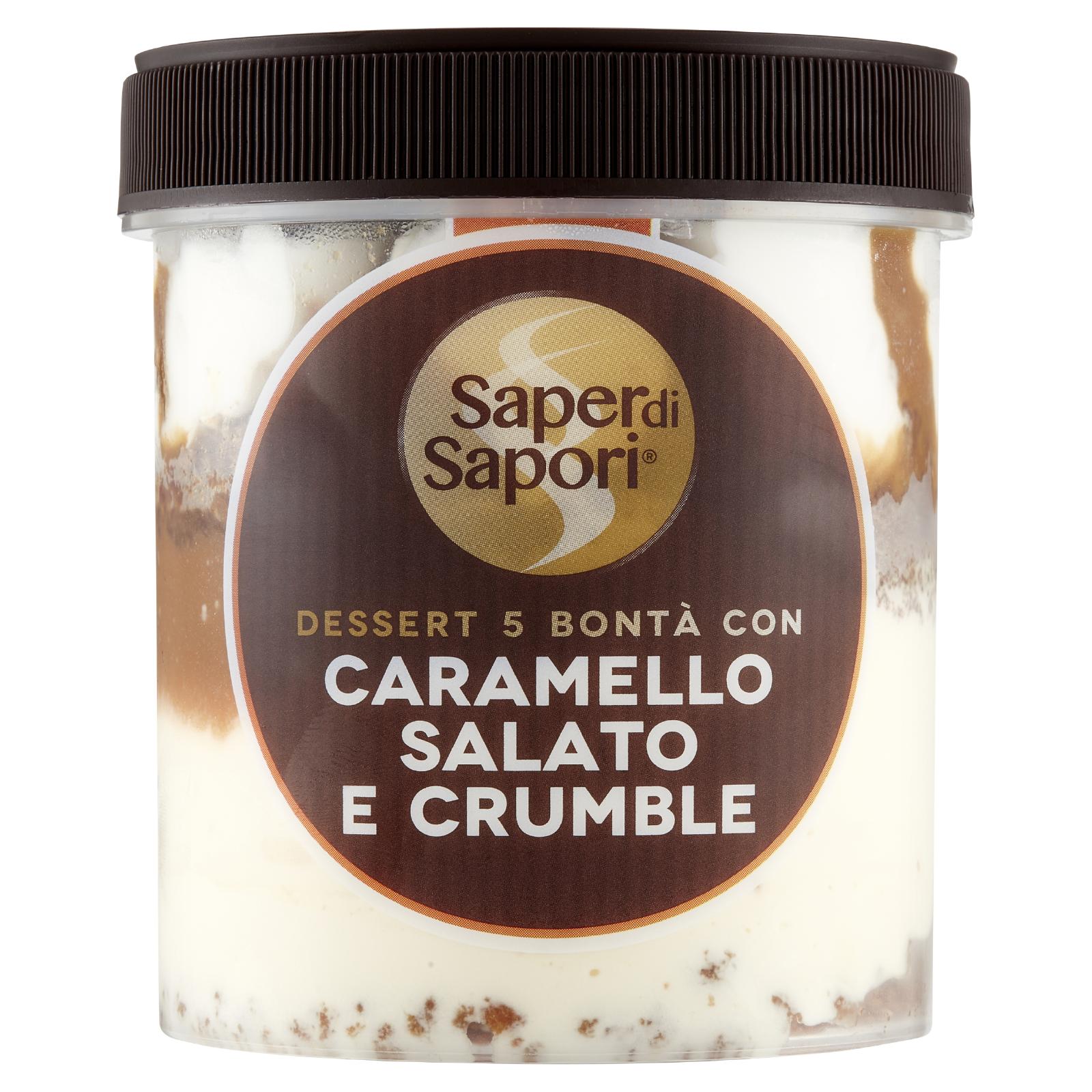 - Dessert con gelato al gusto vaniglia, gelato al fiordilatte con topping al caramello salato, strati di crumble di biscotto caramellato e crumble al cacao. Congelato